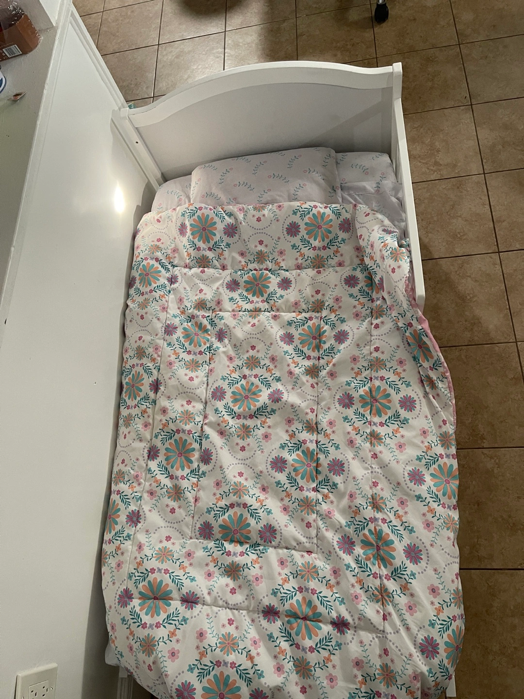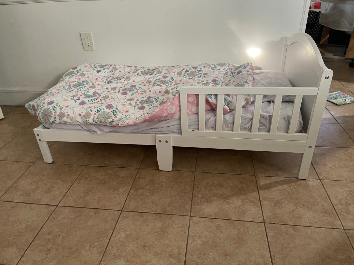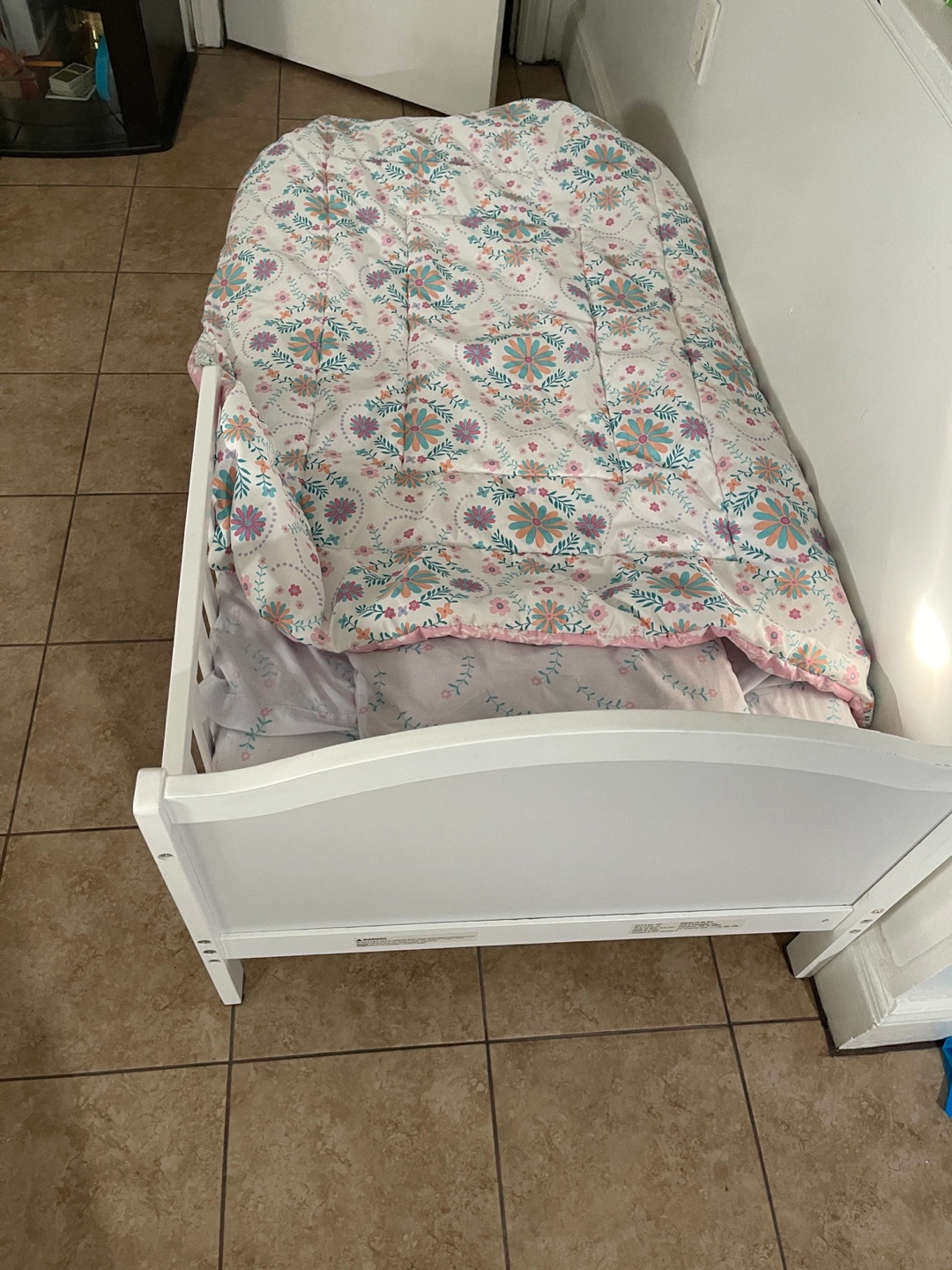 White toddler bed with guardrail. Includes mattress, pillow and blanket. Very Good condition. My child outgrew.