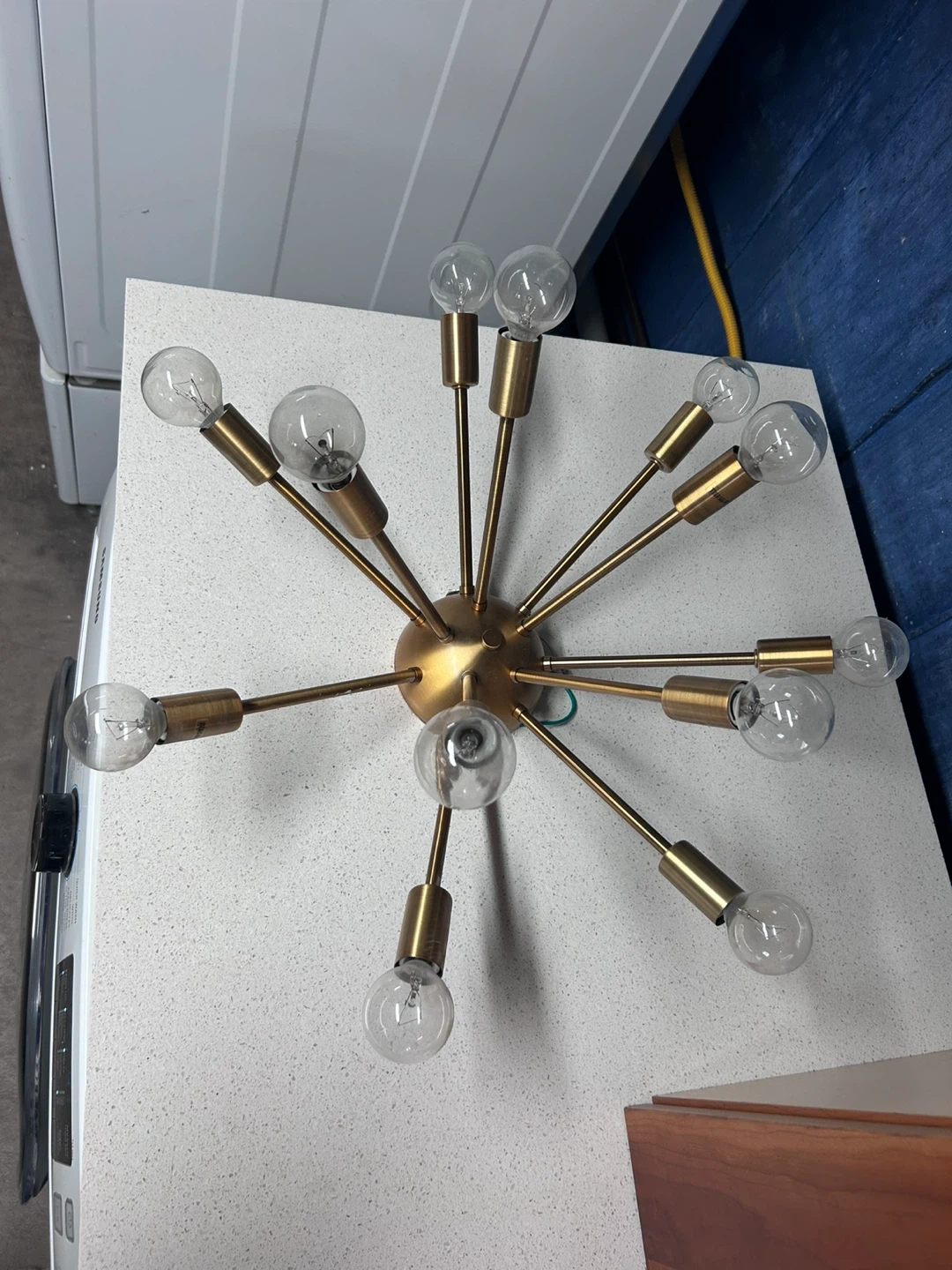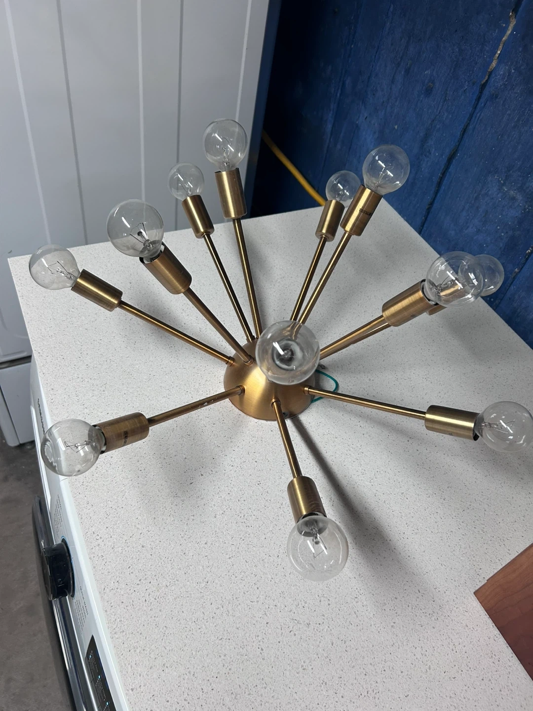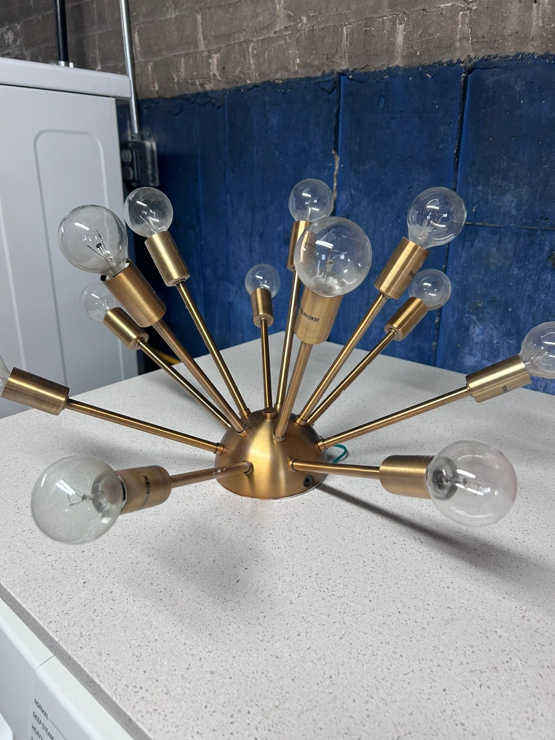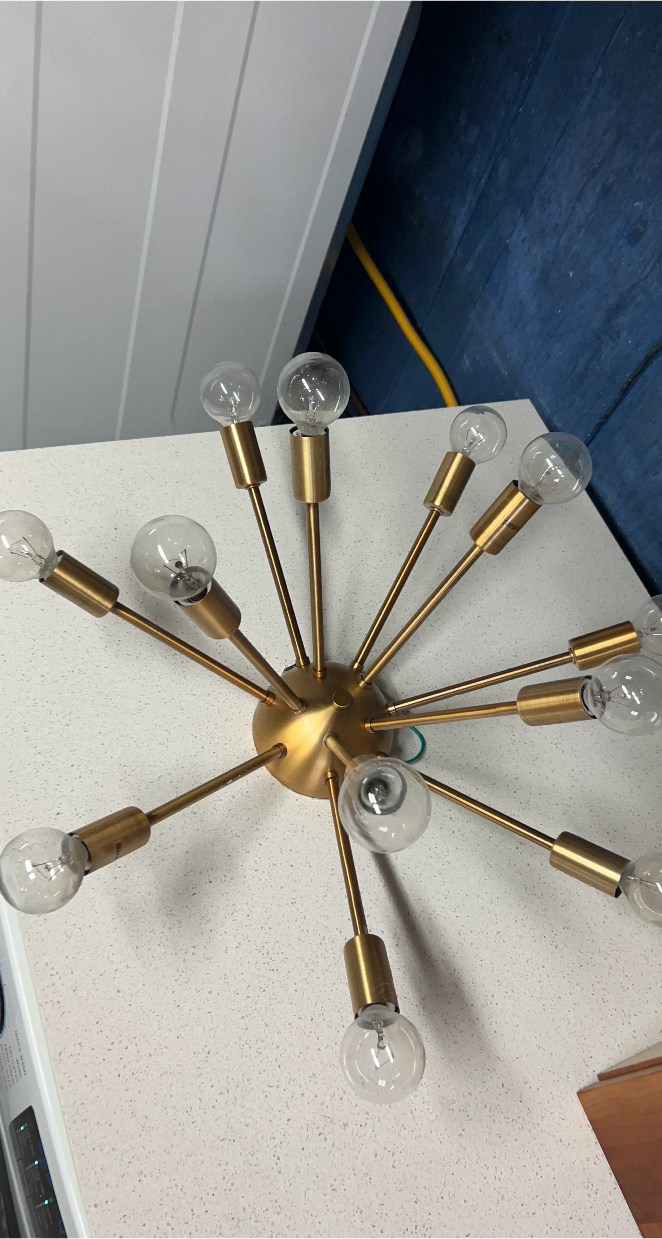 This sputnik chandelier features a stunning brass finish. It's designed with multiple arms extending from a central point, each holding a light bulb. The fixture's starburst design adds a modern, eye-catching element to any room.