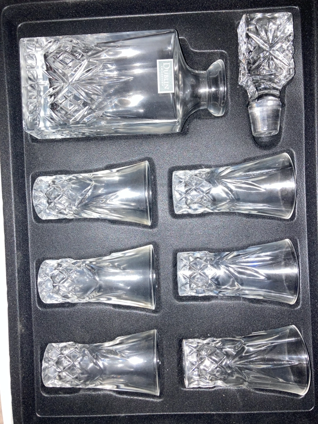 Selling a beautiful Dublin crystal decanter and shot glass set! It includes a decanter with a stopper and six shot glasses, all in excellent condition. Perfect for entertaining or adding a touch of elegance to your home bar