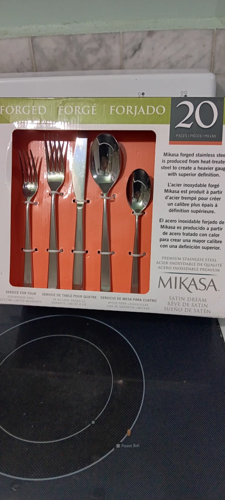 Selling a Mikasa Satin Dream 20-piece flatware set! It's forged from stainless steel, creating a heavier gauge with superior definition. This set is service for four. Includes a lifetime limited warranty. It's dishwasher safe too!