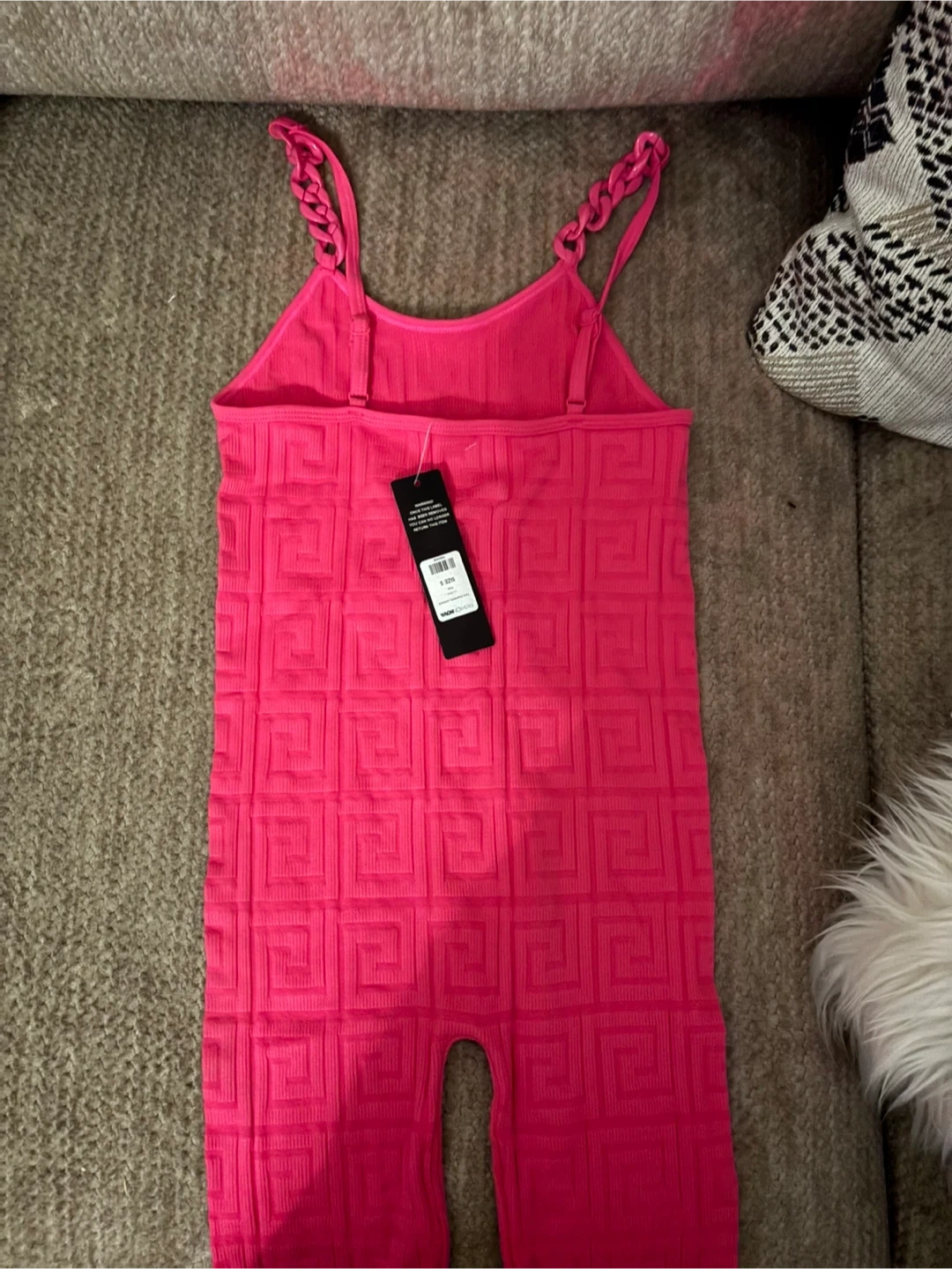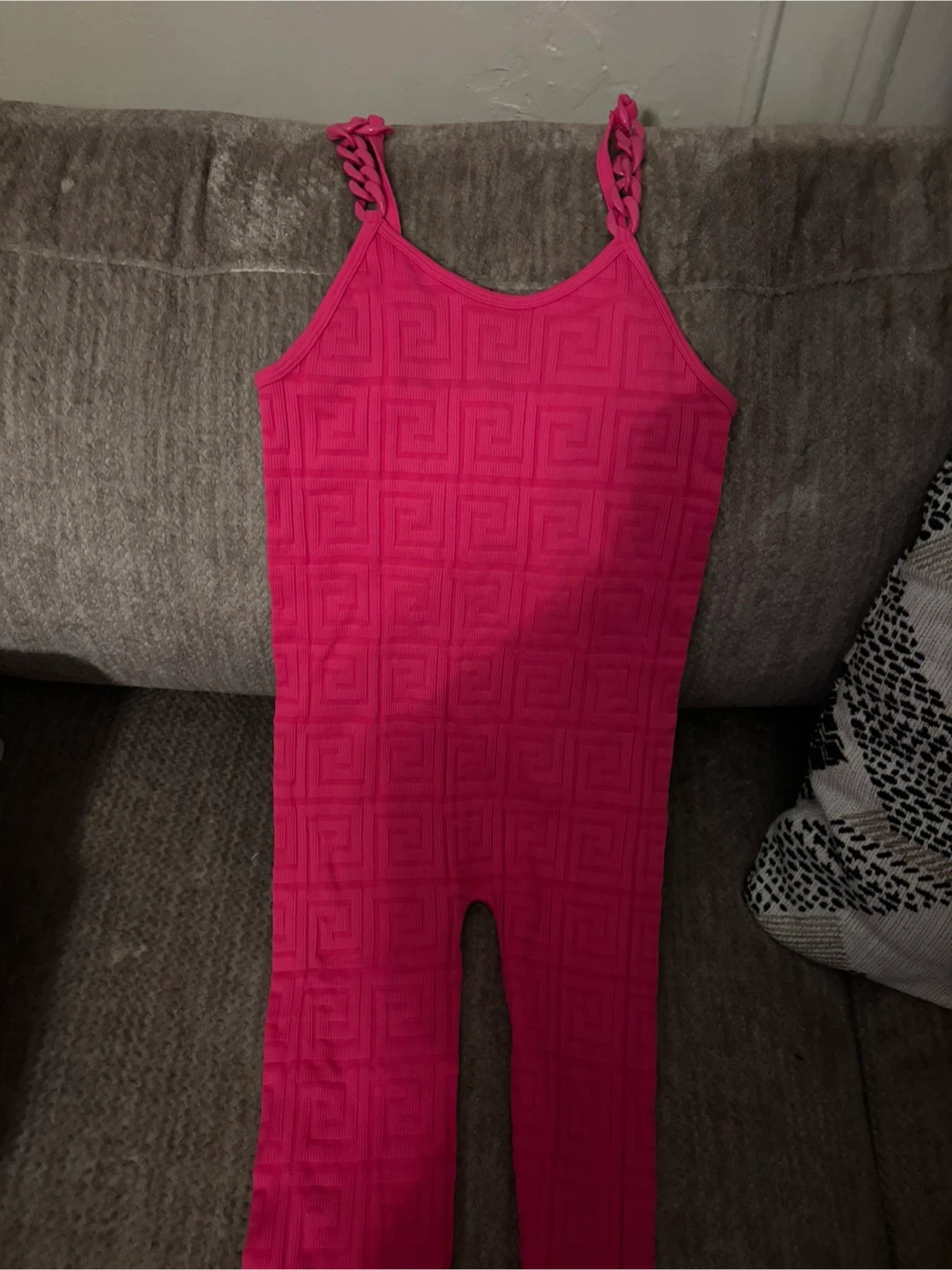 This hot pink ribbed bodysuit features a textured geometric pattern and decorative chain straps. It's a one-piece design with spaghetti straps. The material is stretchy for a comfortable fit. Great for layering or wearing on its own!