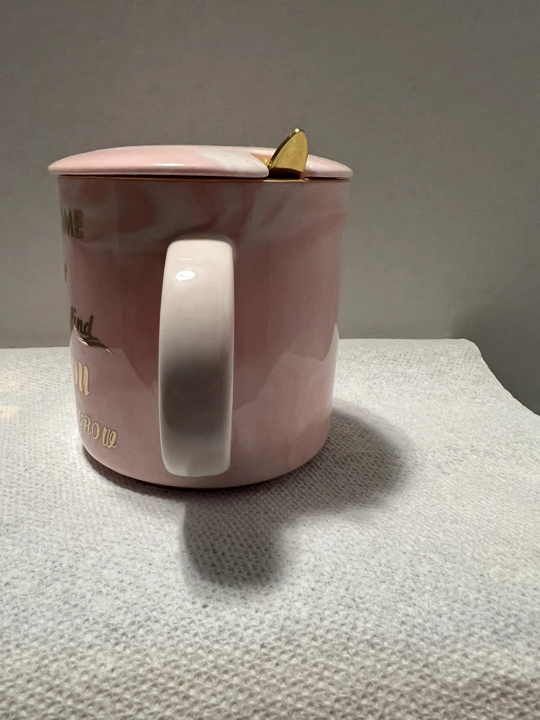 I'm selling a cute pink mug with a lid and a spoon! It has a sweet message for a teacher on it: "An Awesome Teacher is not easy to find. Thank you for helping me grow!" The lid says "Best Teacher Ever". It's perfect for gifting or just to show your appreciation.