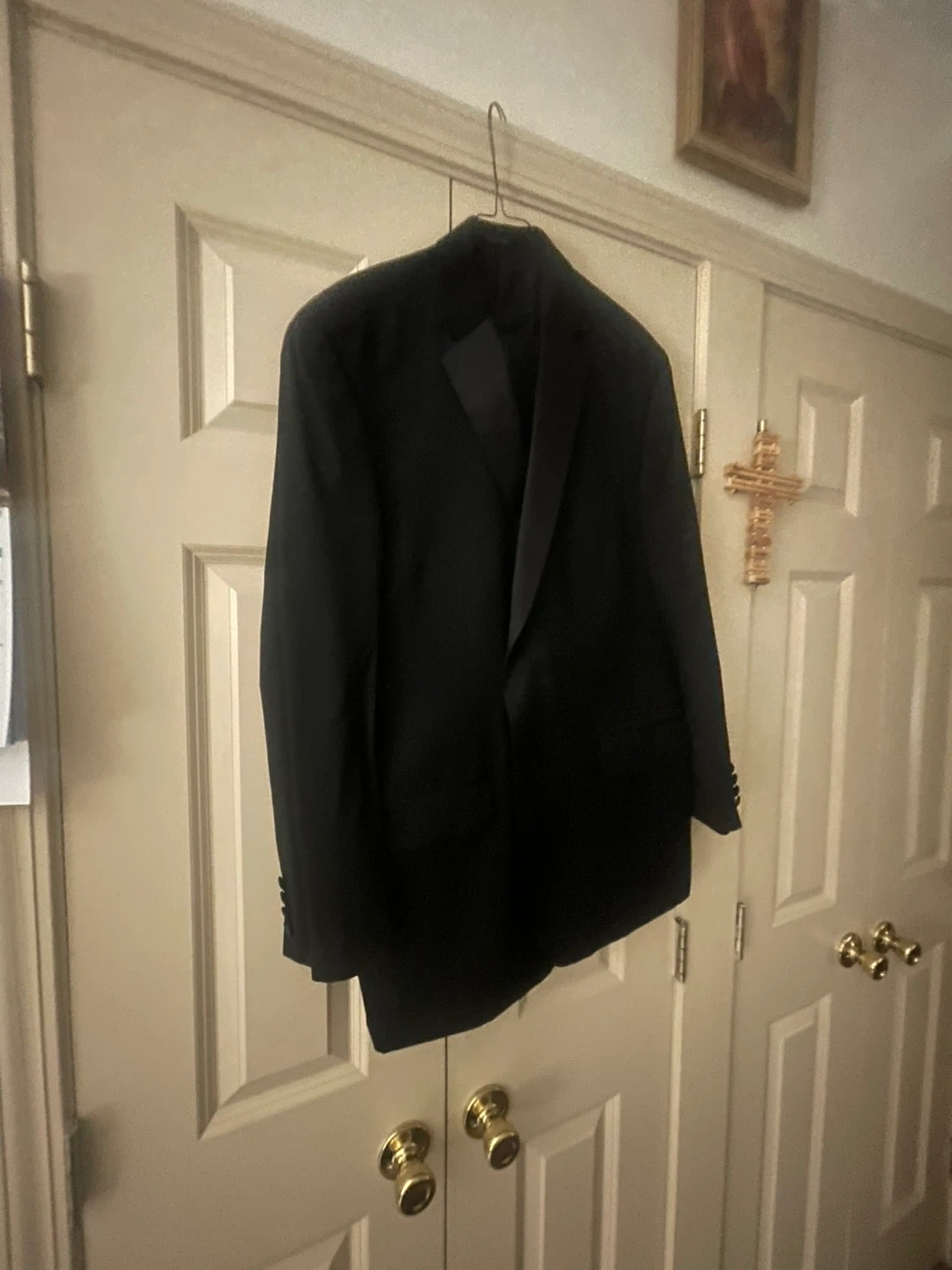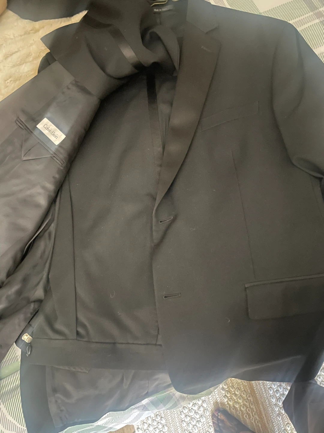 This is a Calvin Klein tuxedo jacket. It's black with satin lapels. A classic choice for formal events!