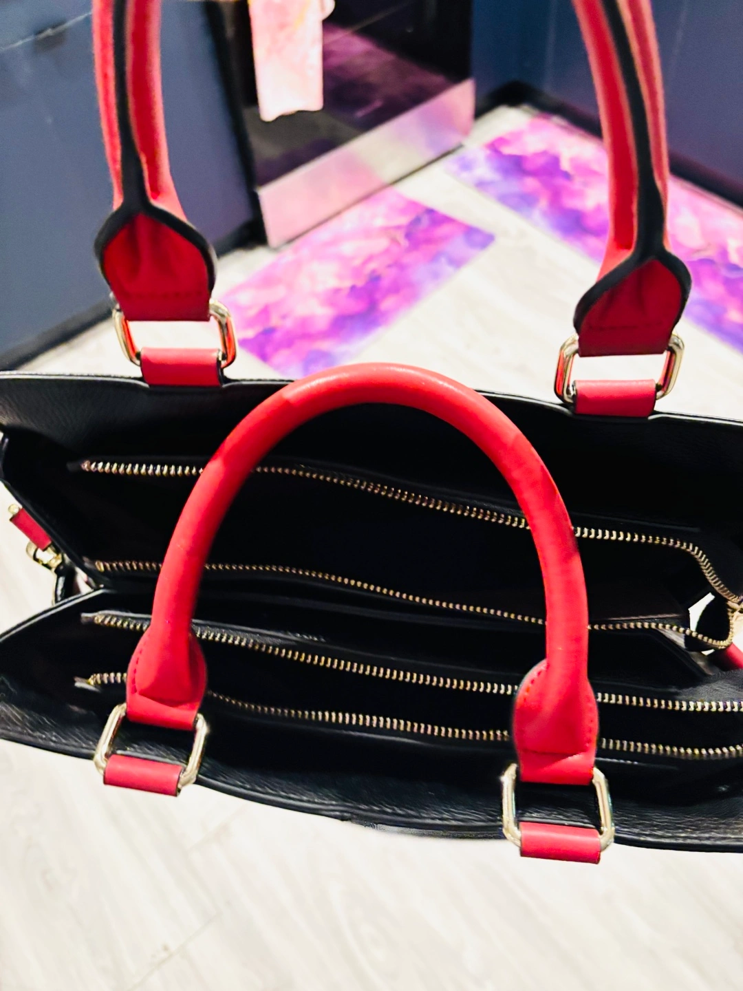 Selling a stylish MCS satchel in black with red accents! This eye-catching bag is perfect for adding a pop of color to any outfit. It features a unique embossed design and sturdy construction. Great for everyday use!