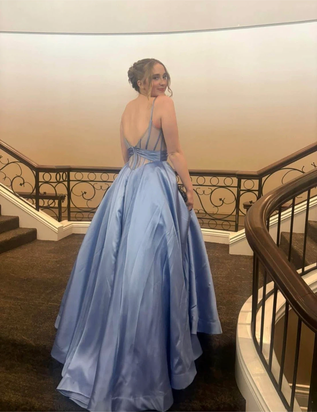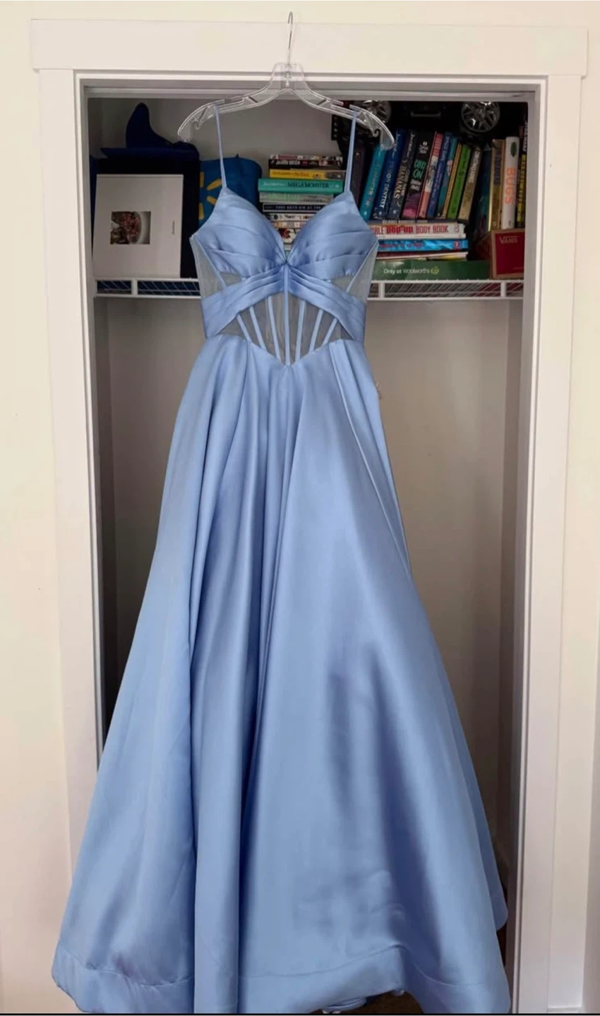 This is a beautiful blue Ellie Wilde formal dress. It's a size 8 and features a flowing satin skirt with a fitted bodice. The dress is perfect for special occasions like proms or weddings!
