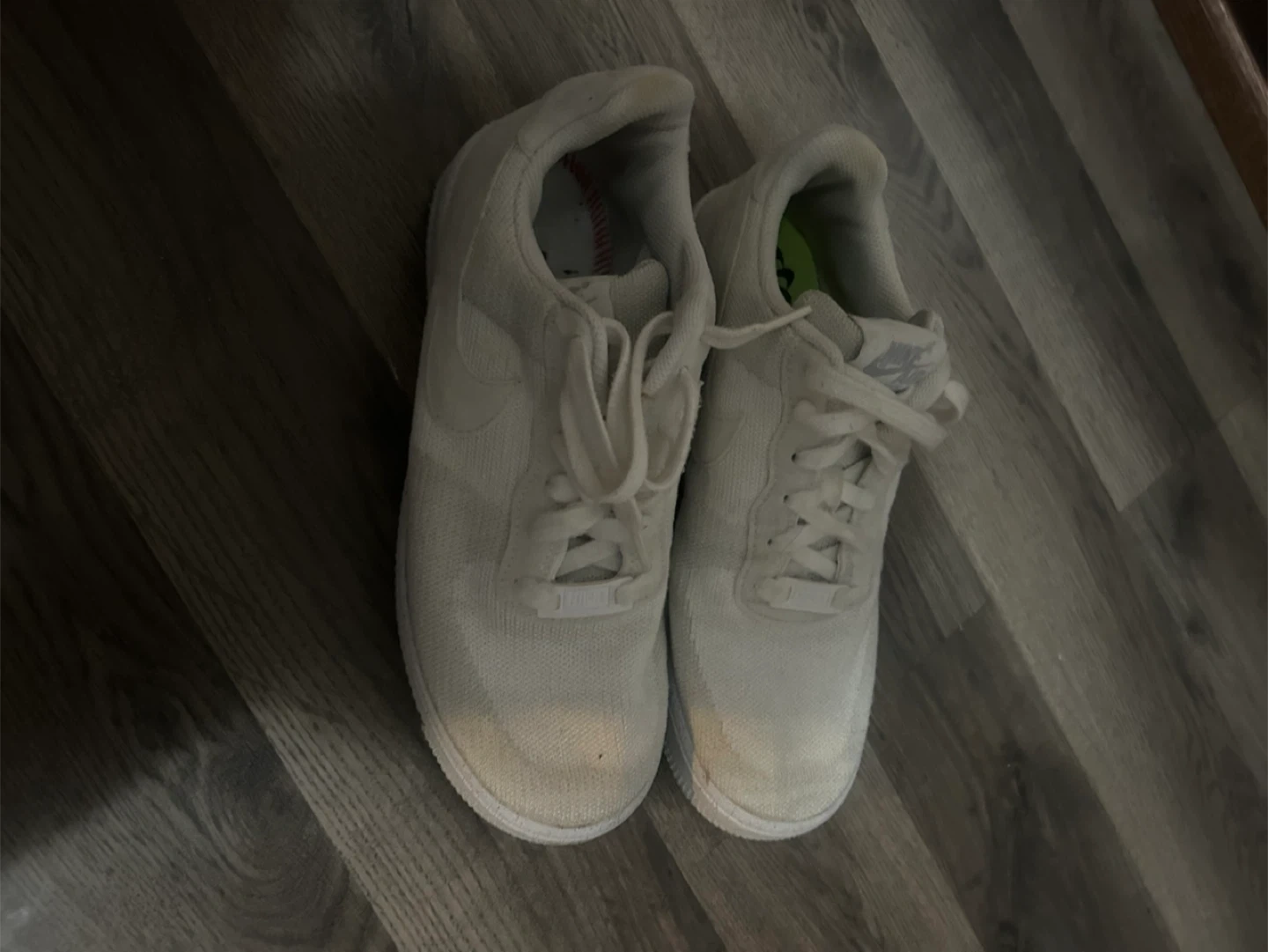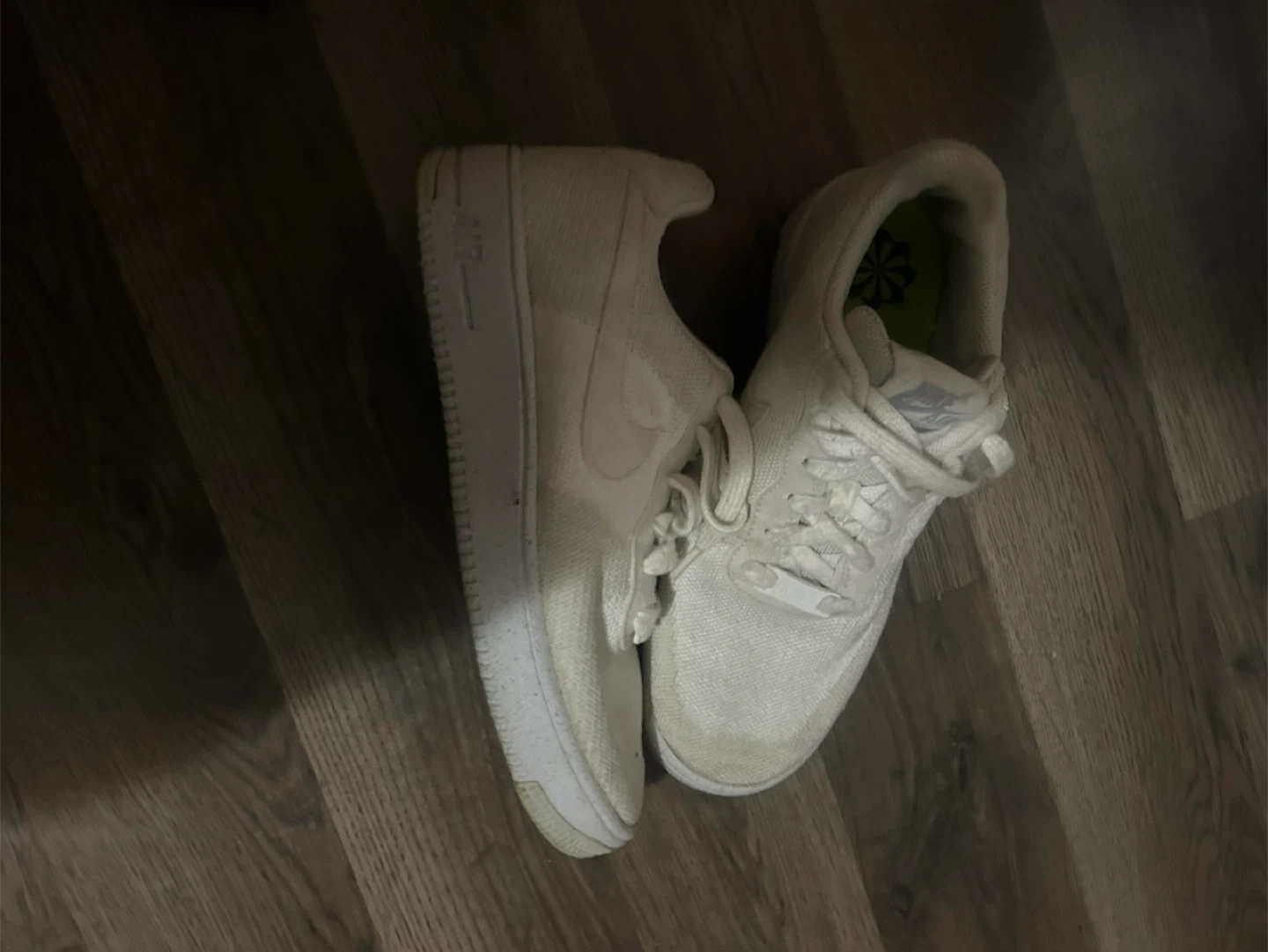 Selling a pair of Nike Air Force 1 sneakers in white. They show some signs of wear, as you can see in the pictures. These are a classic and comfortable style, perfect for everyday wear!