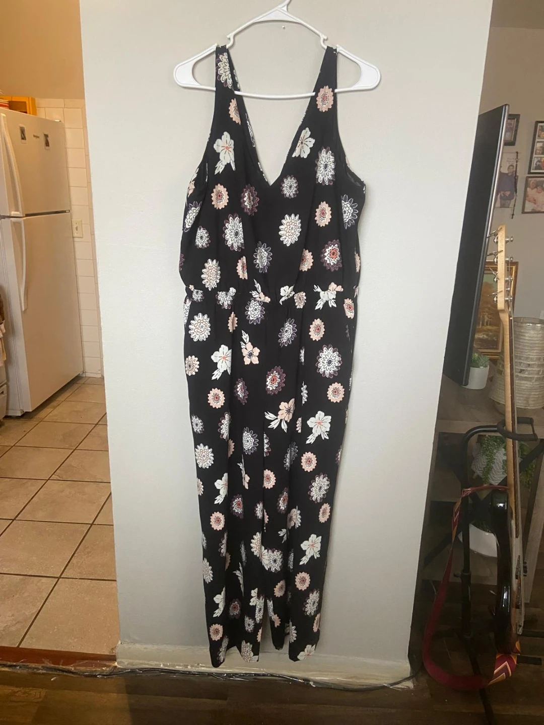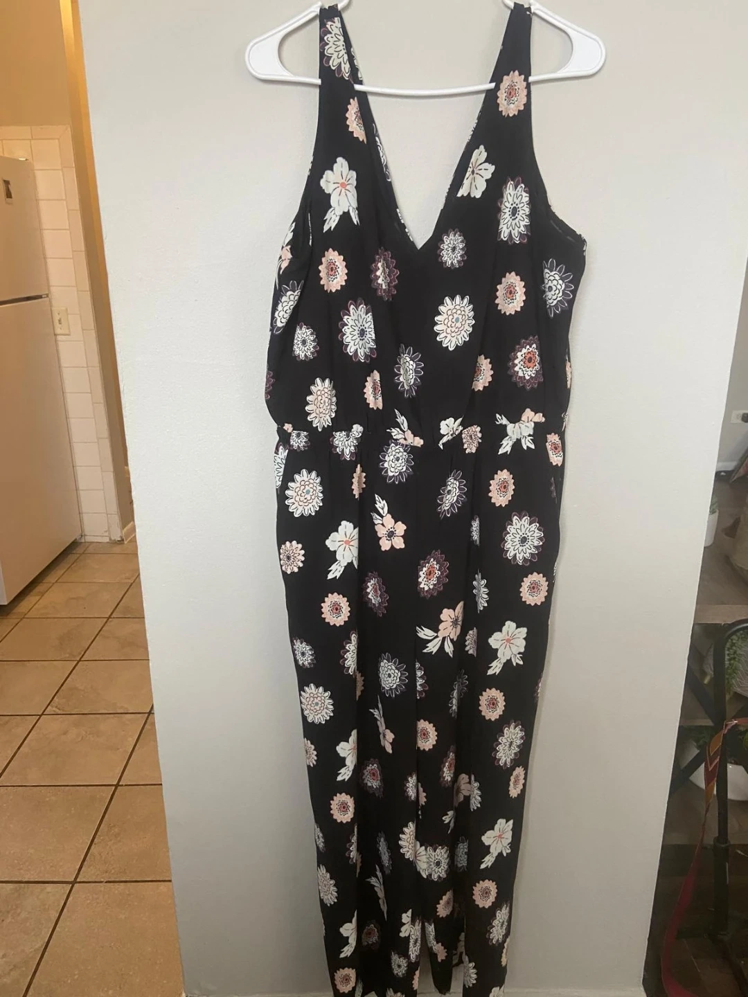 This is a Loft Outlet floral print jumpsuit. It's a size large. The jumpsuit has a V-neck and adjustable straps. It's perfect for warm weather outings!