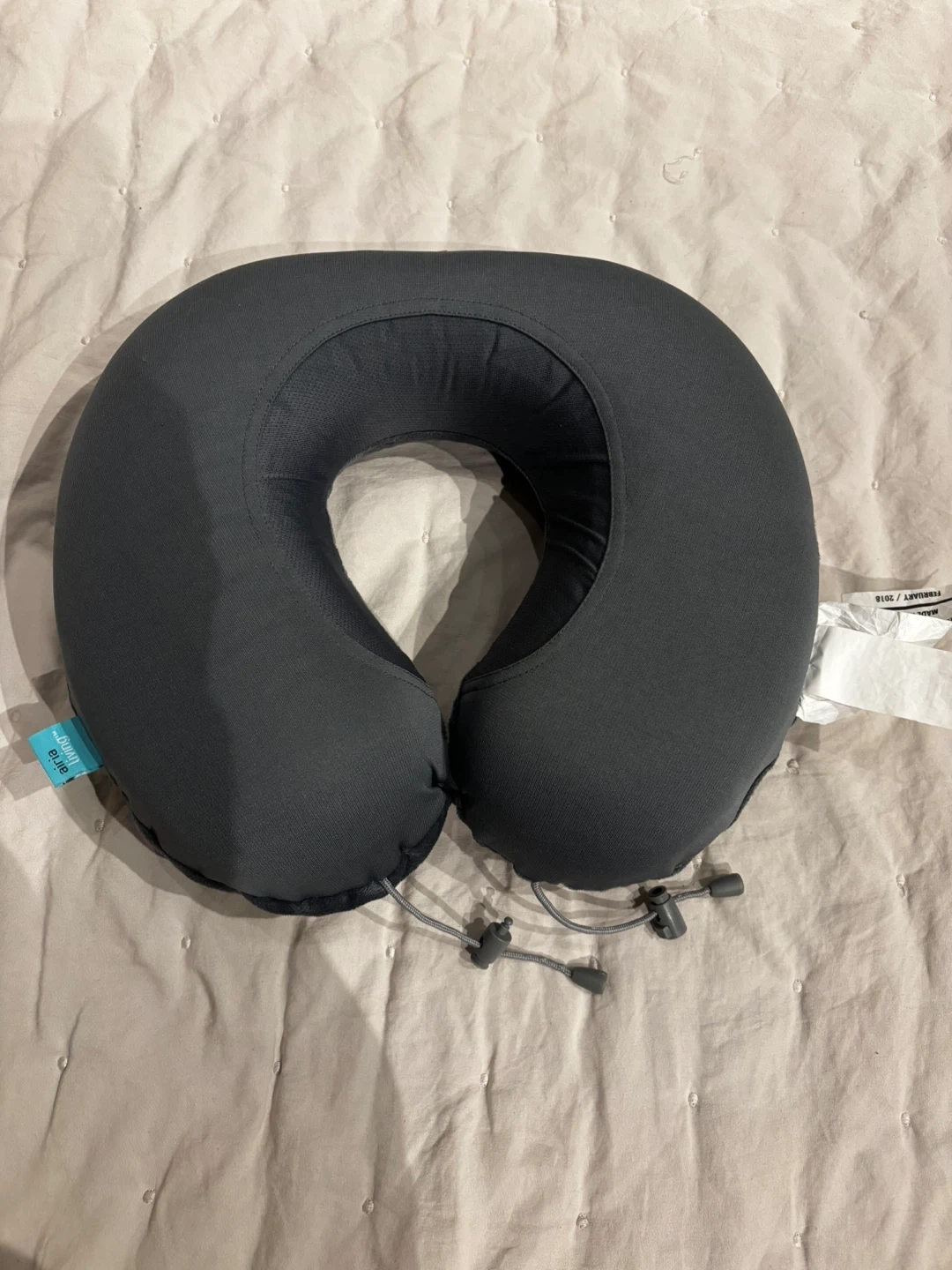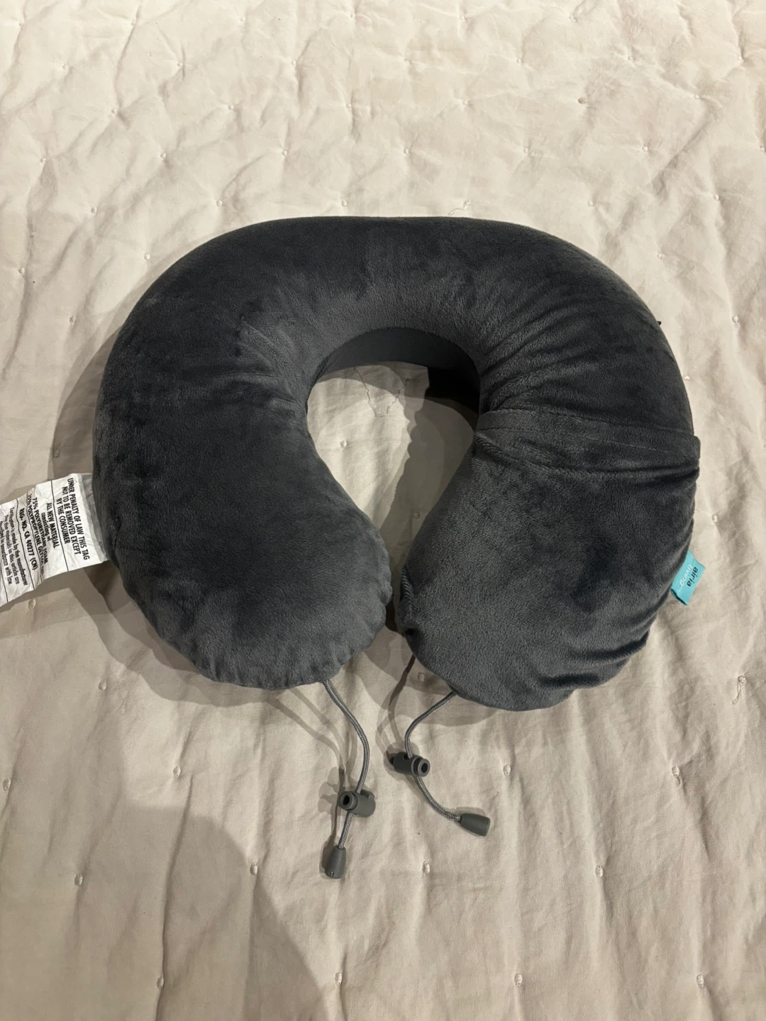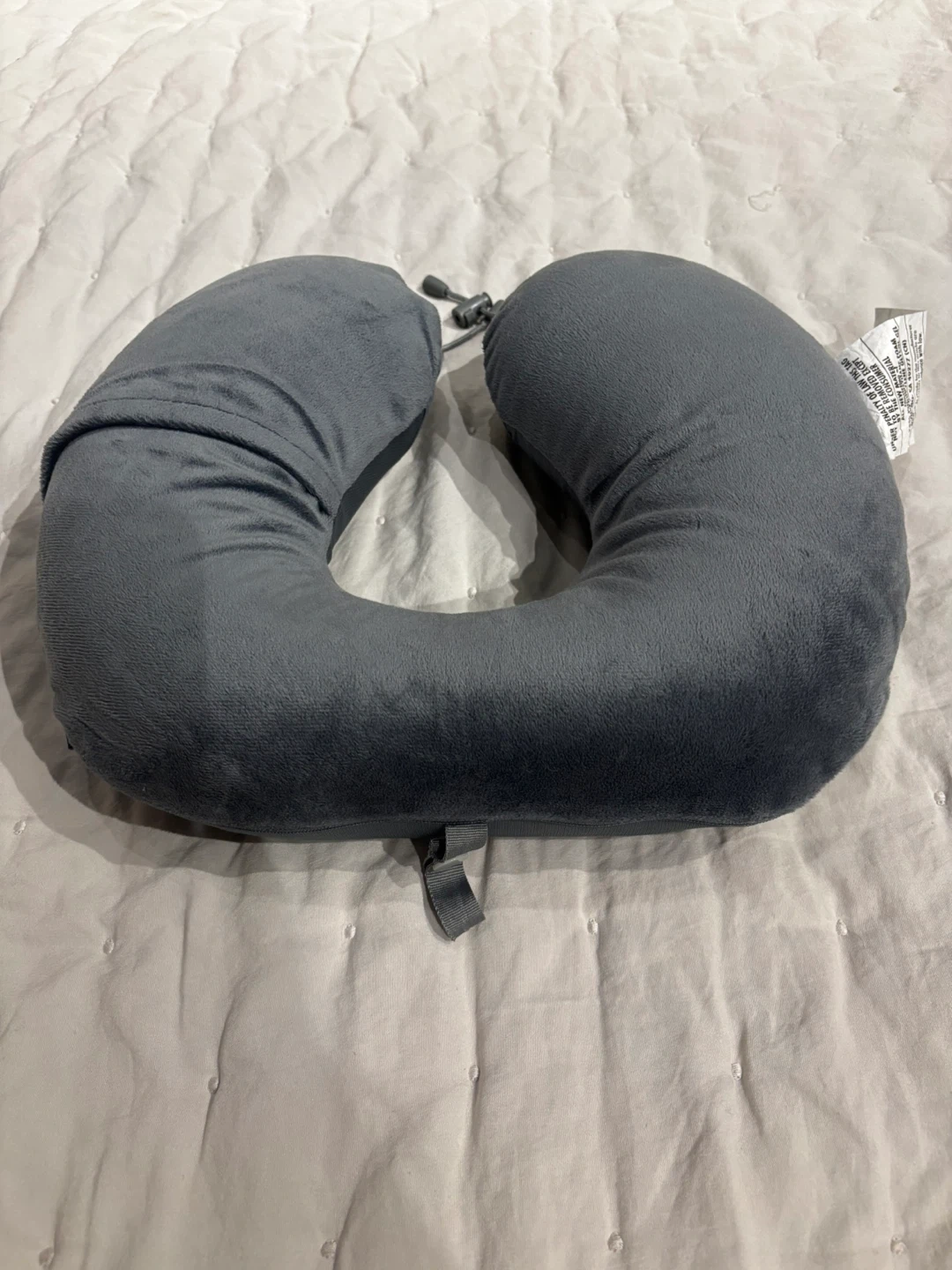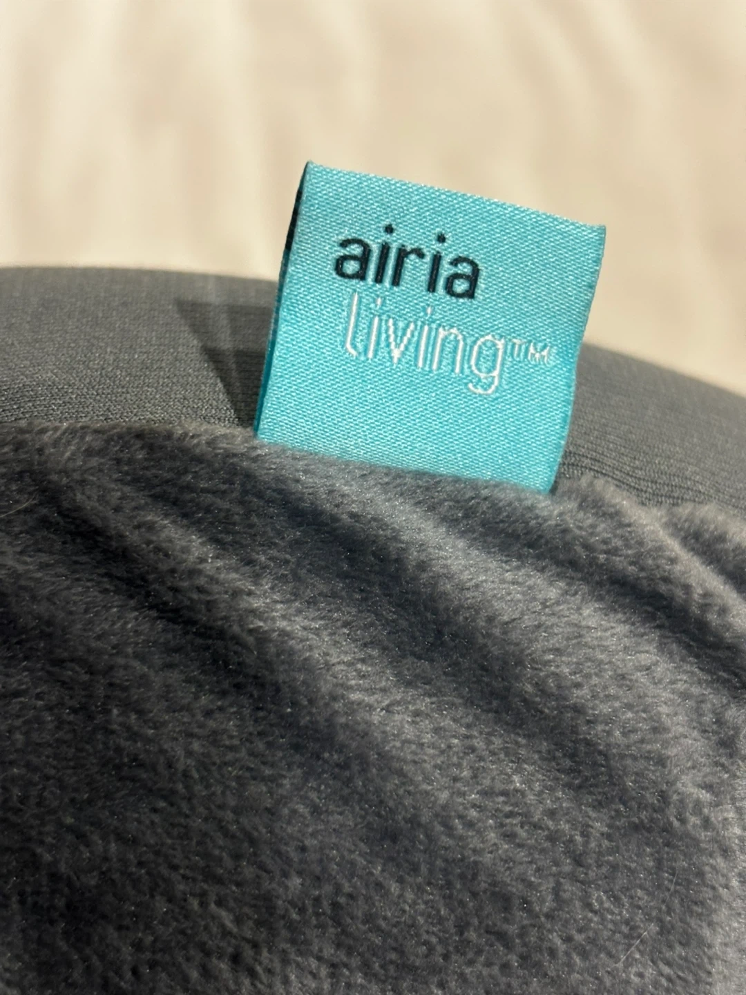 This is a gray Airia Living neck pillow. It's made with a soft plush material. The pillow has a snap closure and adjustable drawstring for a secure fit.