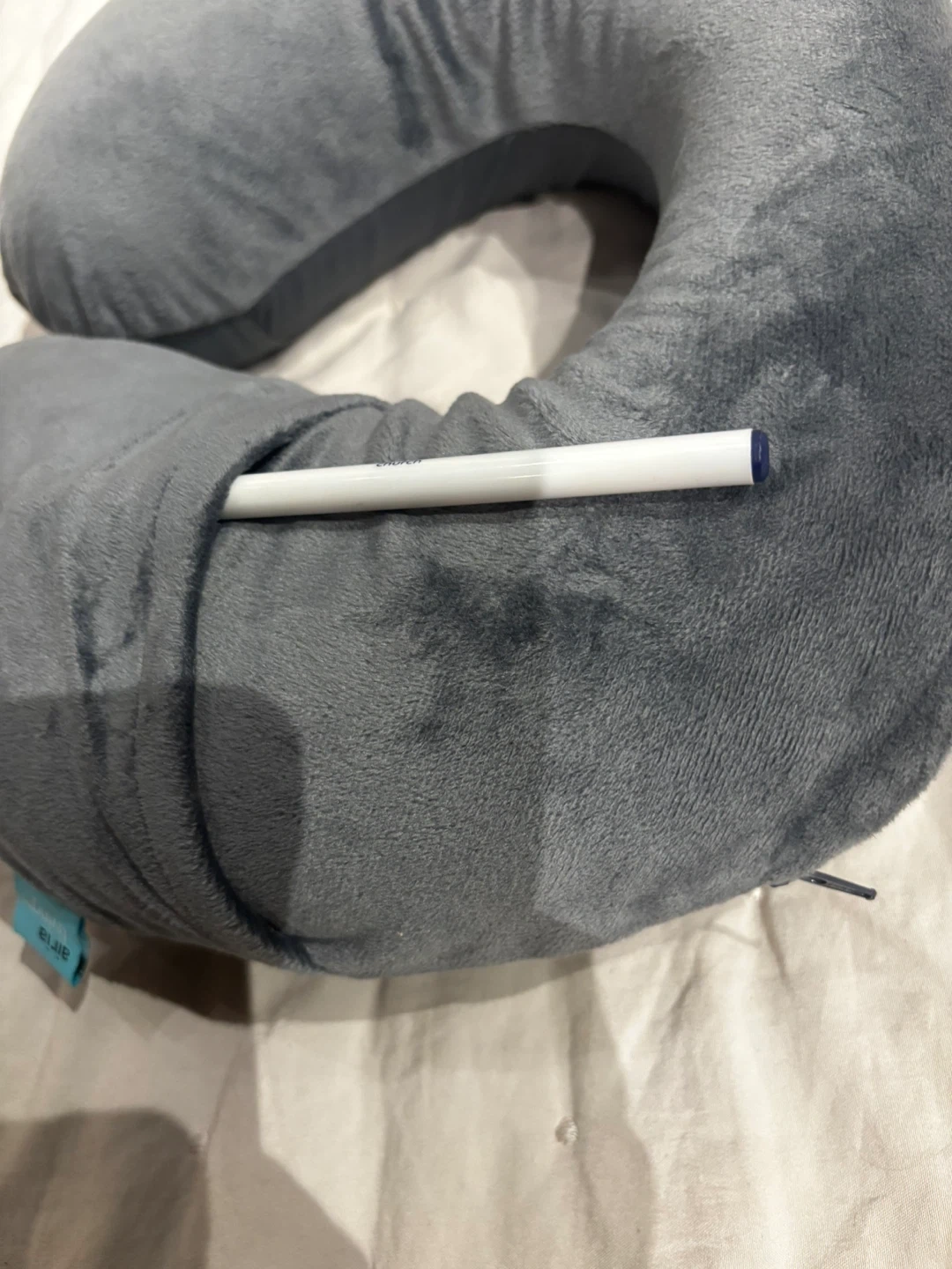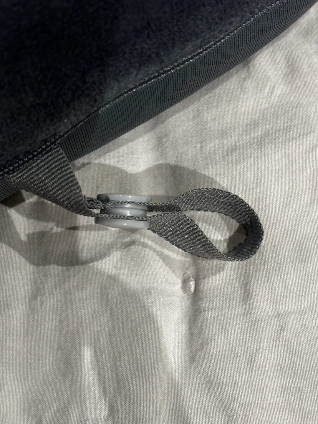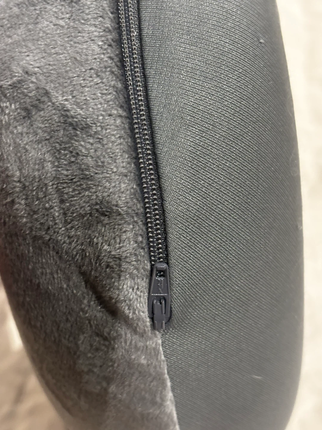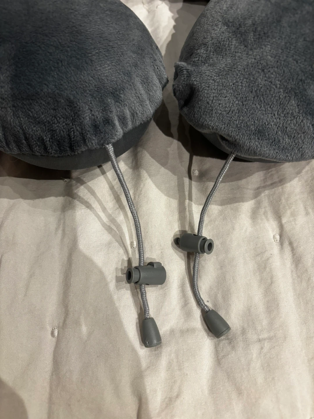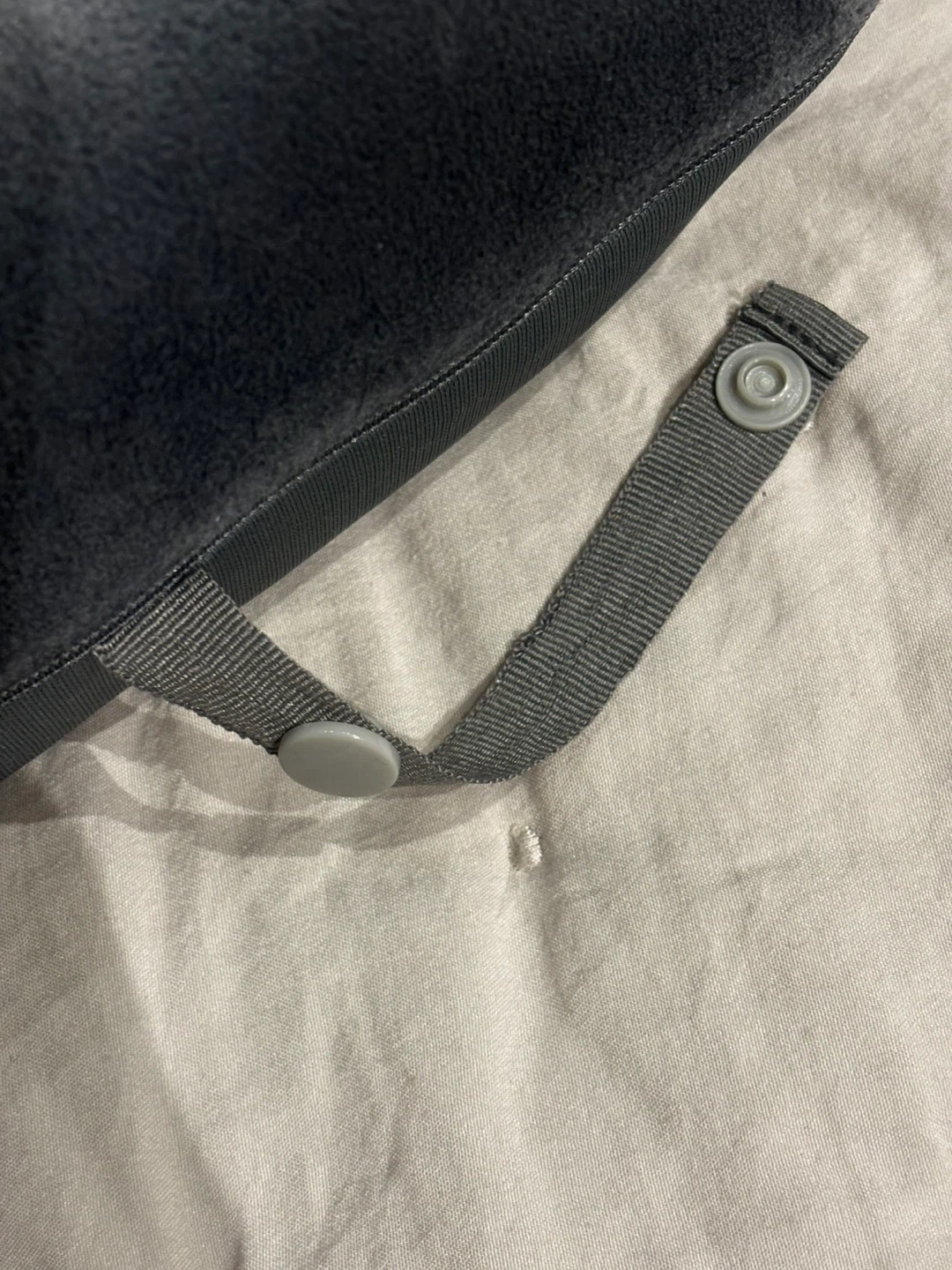 This is a gray Airia Living neck pillow. It's made with a soft plush material. The pillow has a snap closure and adjustable drawstring for a secure fit.