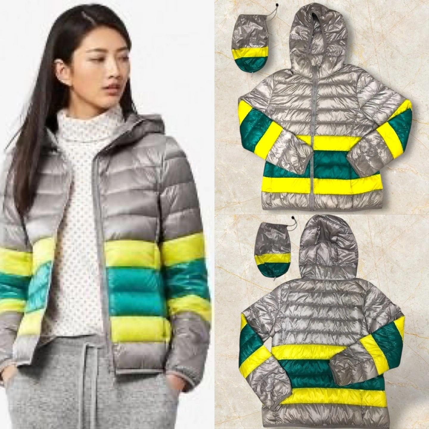 Women's Uniqlo Ultra Light Down Jacket. Size small. Gray color with green and yellow stripes on the sleeves and body. Includes a carrying pouch. Packable and lightweight.