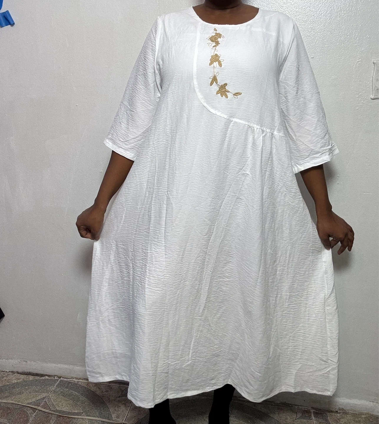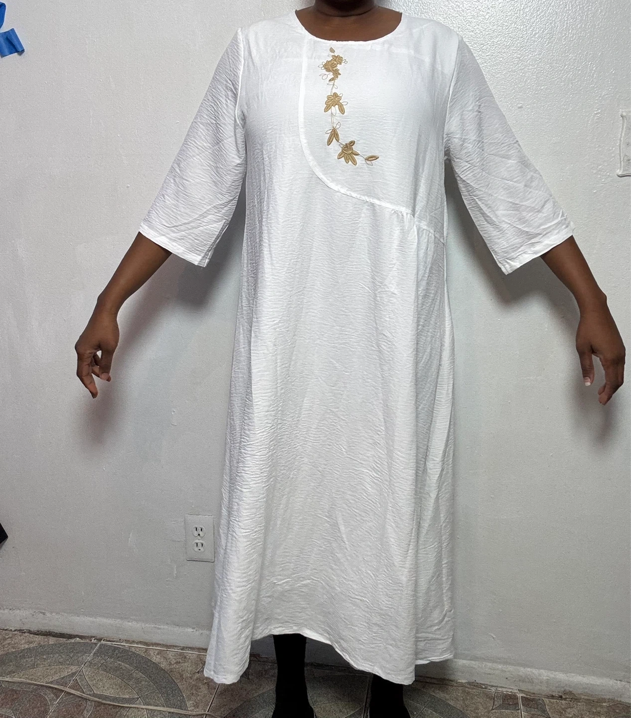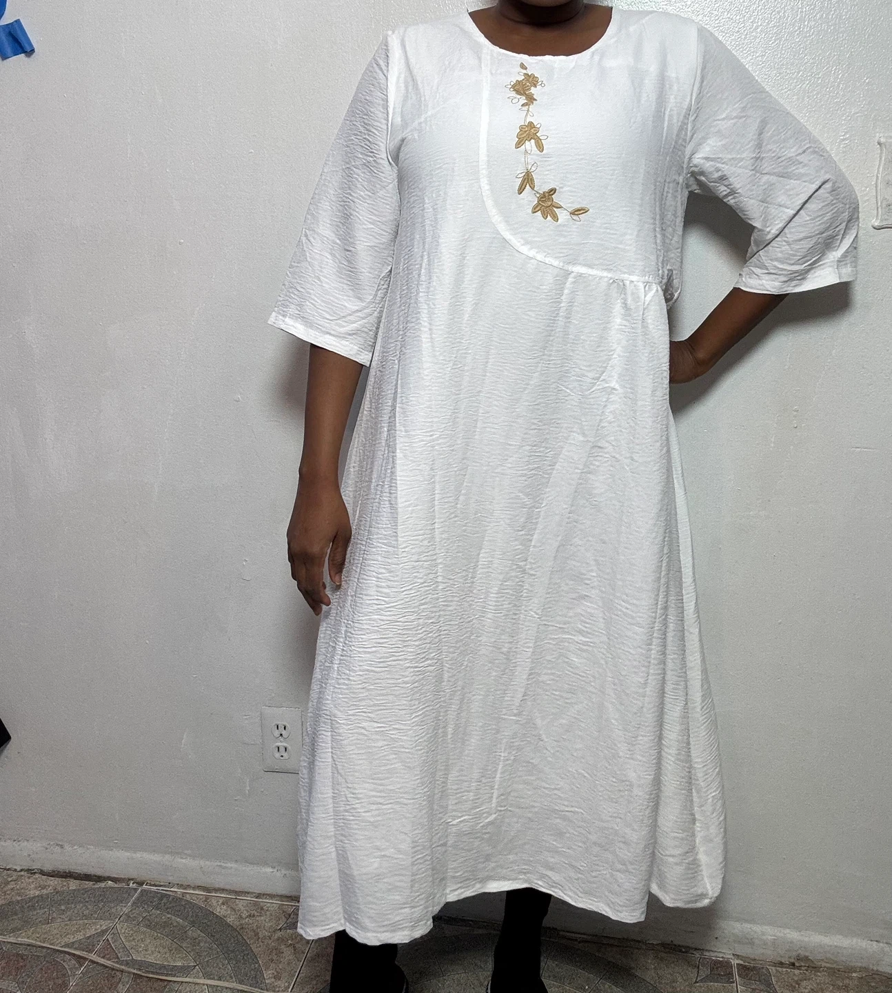 Loose-fitting white maxi dress with delicate gold floral embroidery on the bodice. It has elbow-length sleeves and a flowing silhouette. This dress is perfect for casual wear or special occasions!