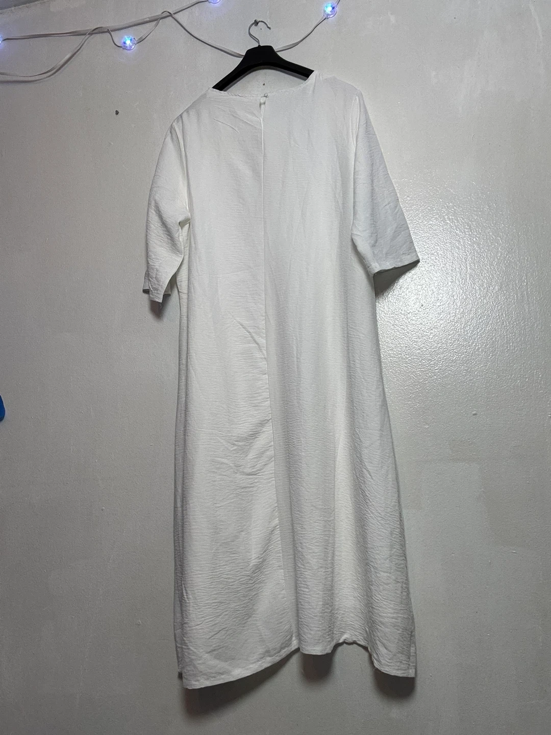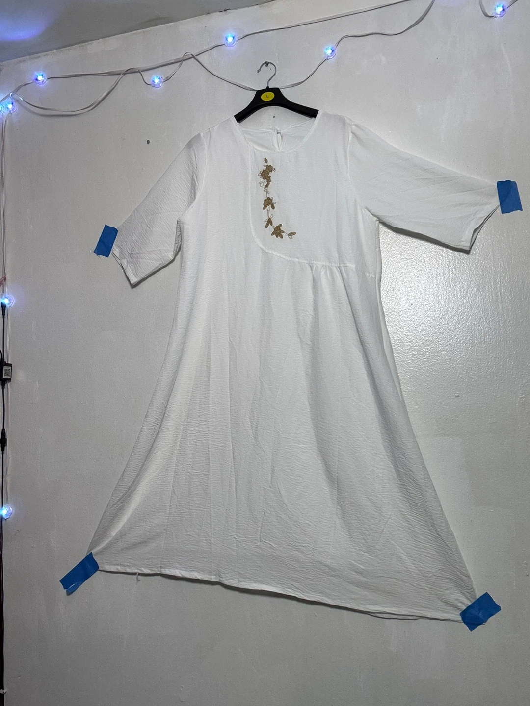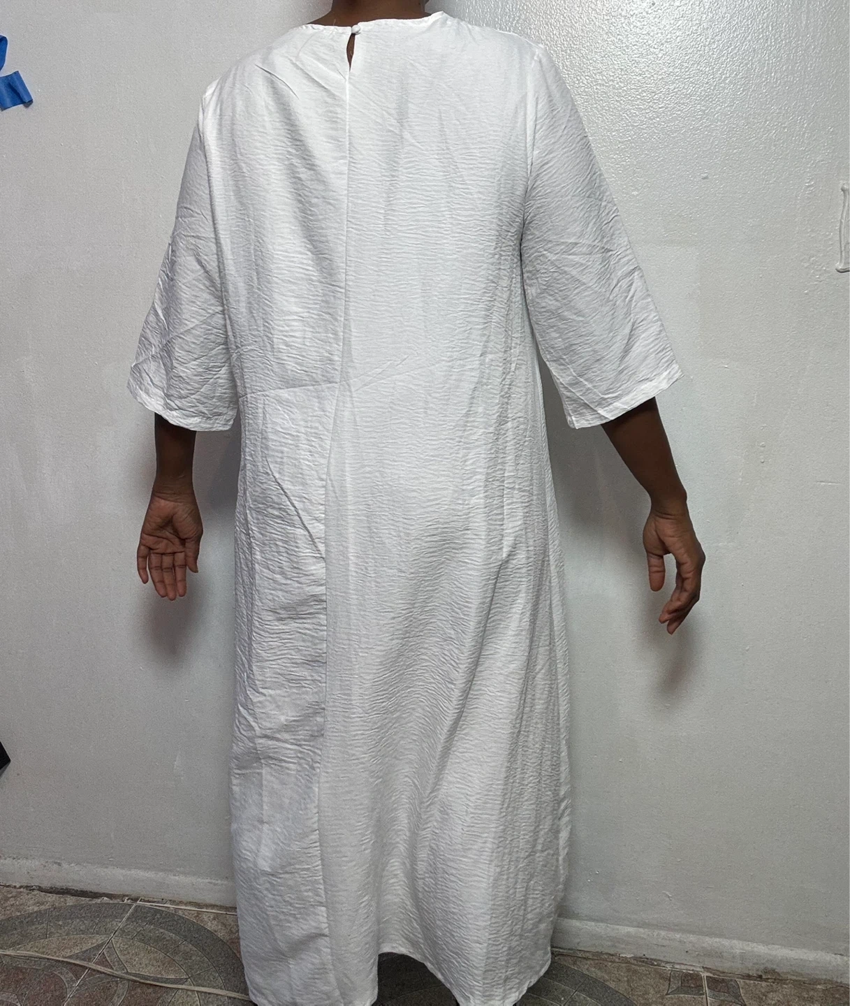 Loose-fitting white maxi dress with delicate gold floral embroidery on the bodice. It has elbow-length sleeves and a flowing silhouette. This dress is perfect for casual wear or special occasions!
