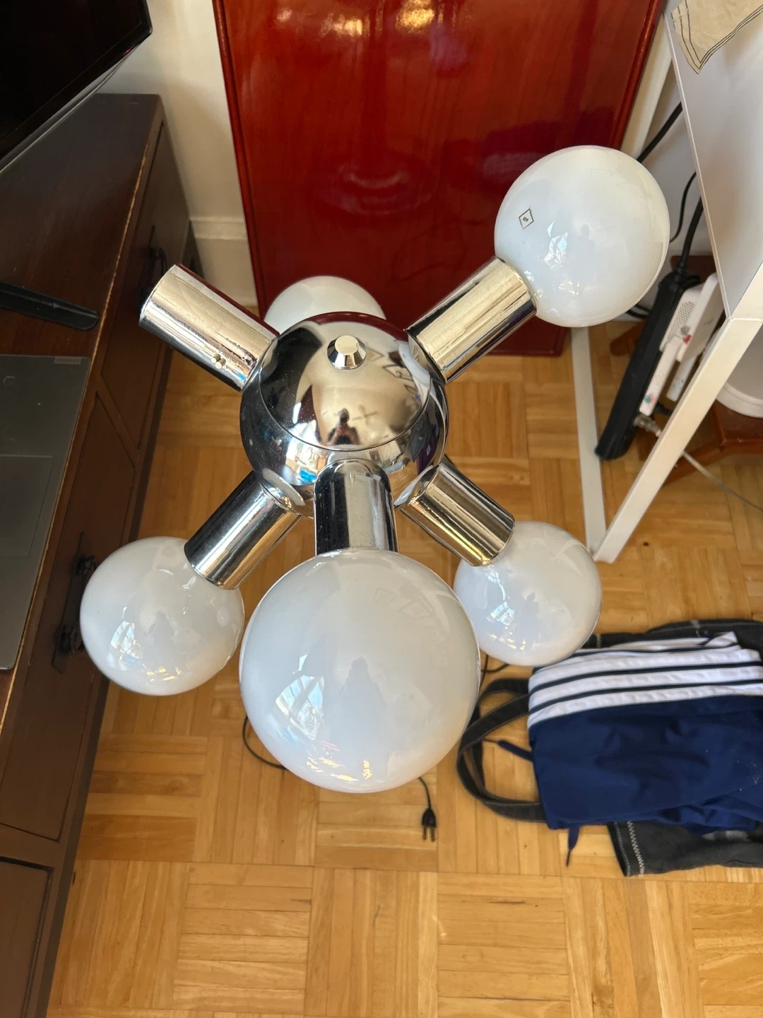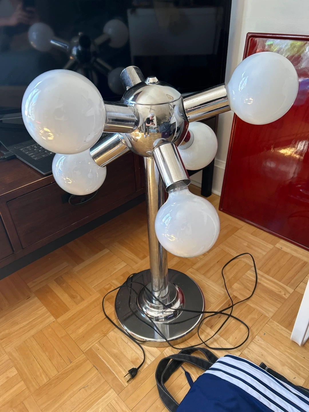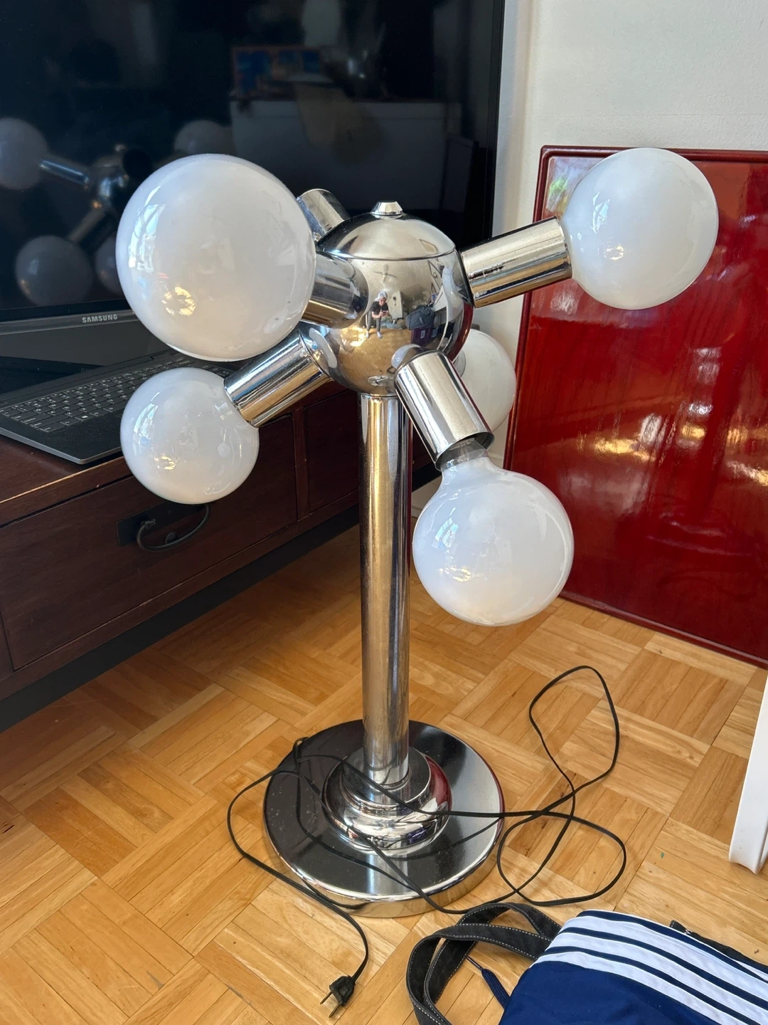 Stylish chrome table lamp with a unique Sputnik design. It features five white globe lights. The lamp is made of metal and glass. This piece provides distinctive ambient lighting!