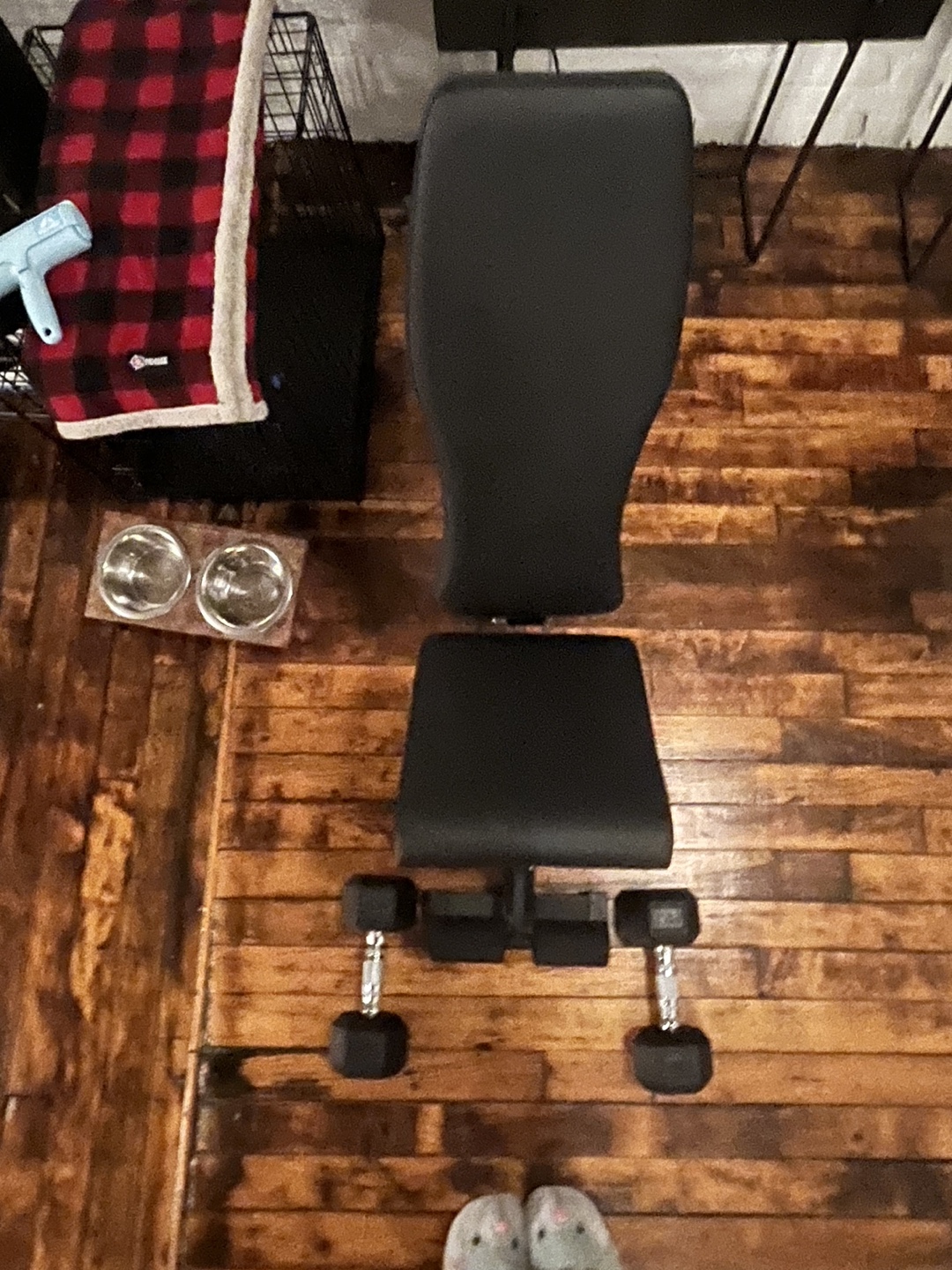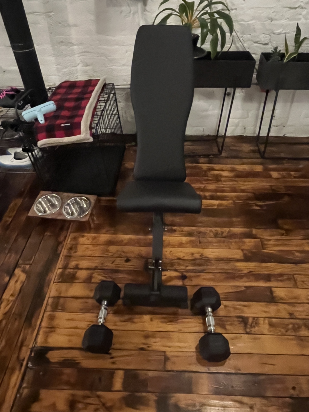 Foldable weight bench, great for home workouts. Includes a pair of 20lb dumbbells. Barely been used Durable construction. Bench is easy and light to move but sturdy enough to use! Amazing bench! Easy to store.