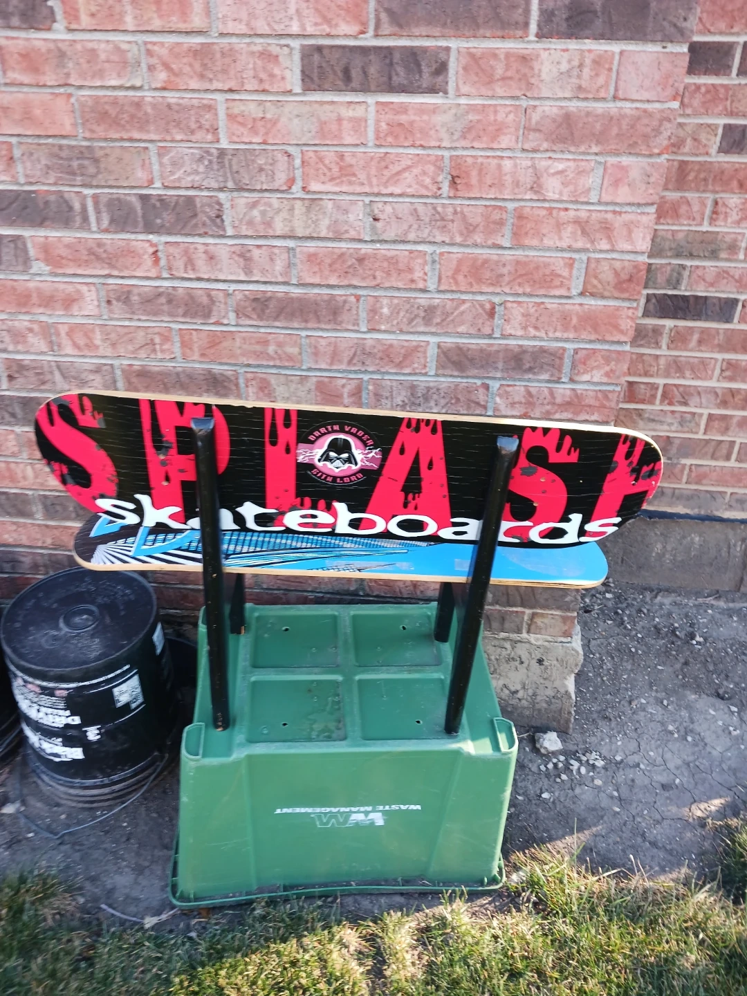This is a Splash Skateboards deck. It features a blue cityscape design on the bottom. The grip tape is black and shows some wear. Made to a kids chair good shape I only do pickup