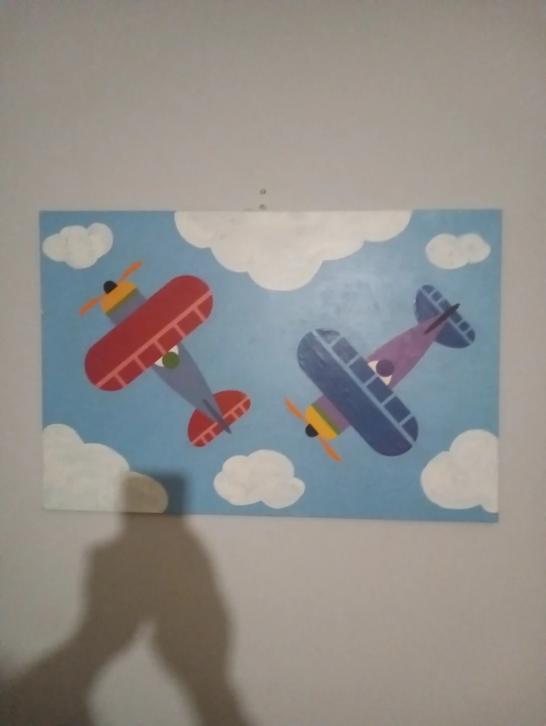 This is a hand-painted canvas featuring two biplanes flying in a blue sky with clouds. The artwork has a playful design, suitable for a child's room. Painted on canvas.