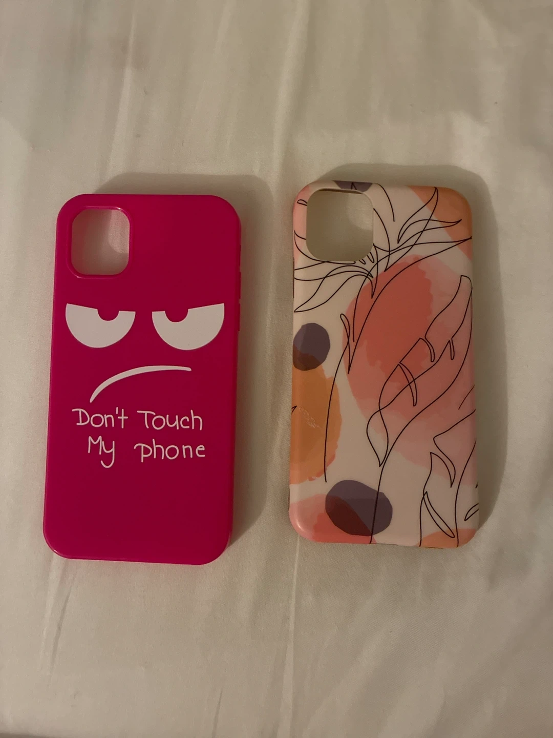 Get two protective phone cases for your iPhone 11 One is bright pink with a fun "Don't Touch My phone" graphic and a grumpy face. The other features a trendy abstract floral design in shades of pink, orange, and purple. Both cases offer a stylish way to keep your phone safe!