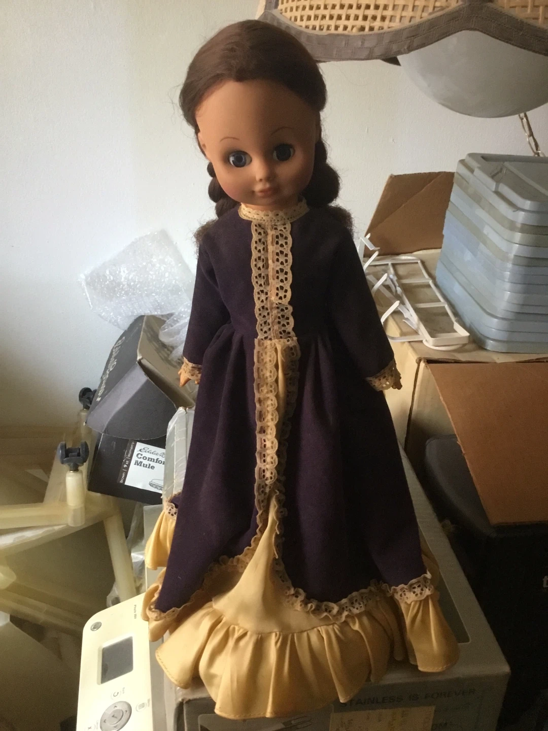 This is a vintage doll wearing a deep purple dress adorned with intricate white lace trim. The dress features a light yellow underskirt with ruffled detailing. Its eyes are a striking blue. The doll appears to be made of plastic with rooted hair.