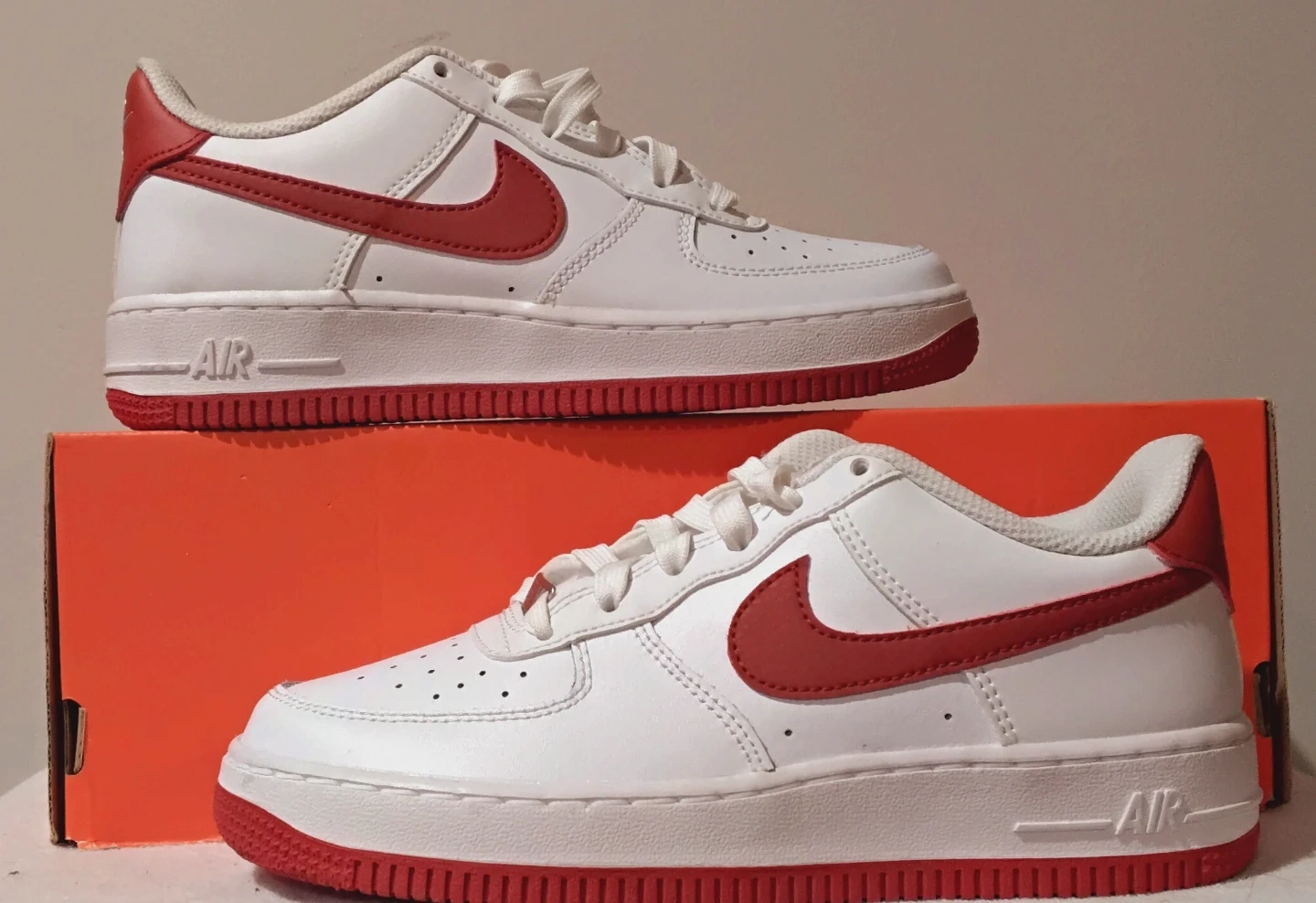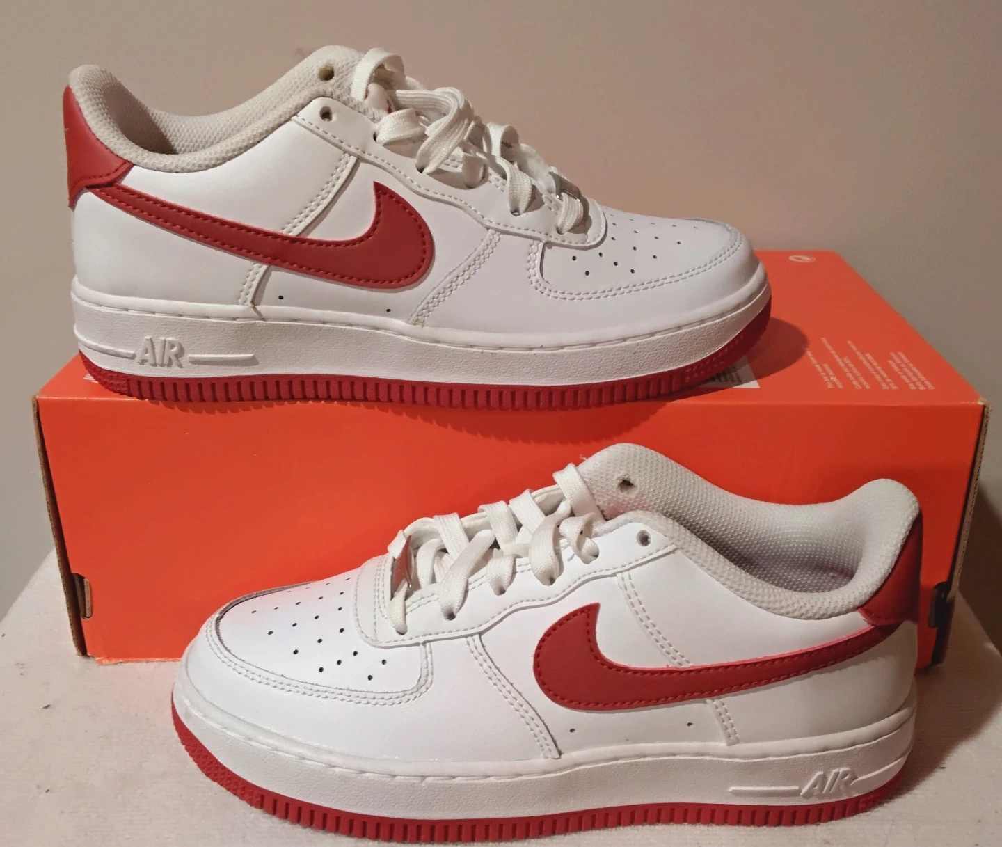 Classic white Nike Air Force 1 Lows for toddlers. Features red accents on the swoosh, heel tab, and sole. These sneakers are built for comfort and style! Leather upper and rubber sole. Size:4Y