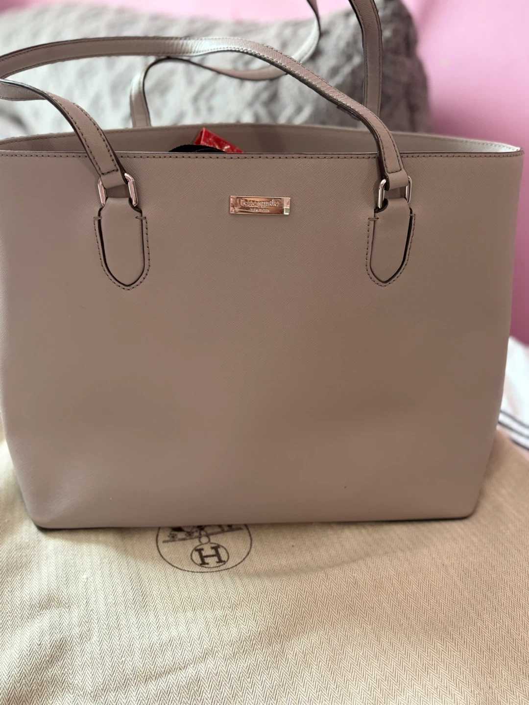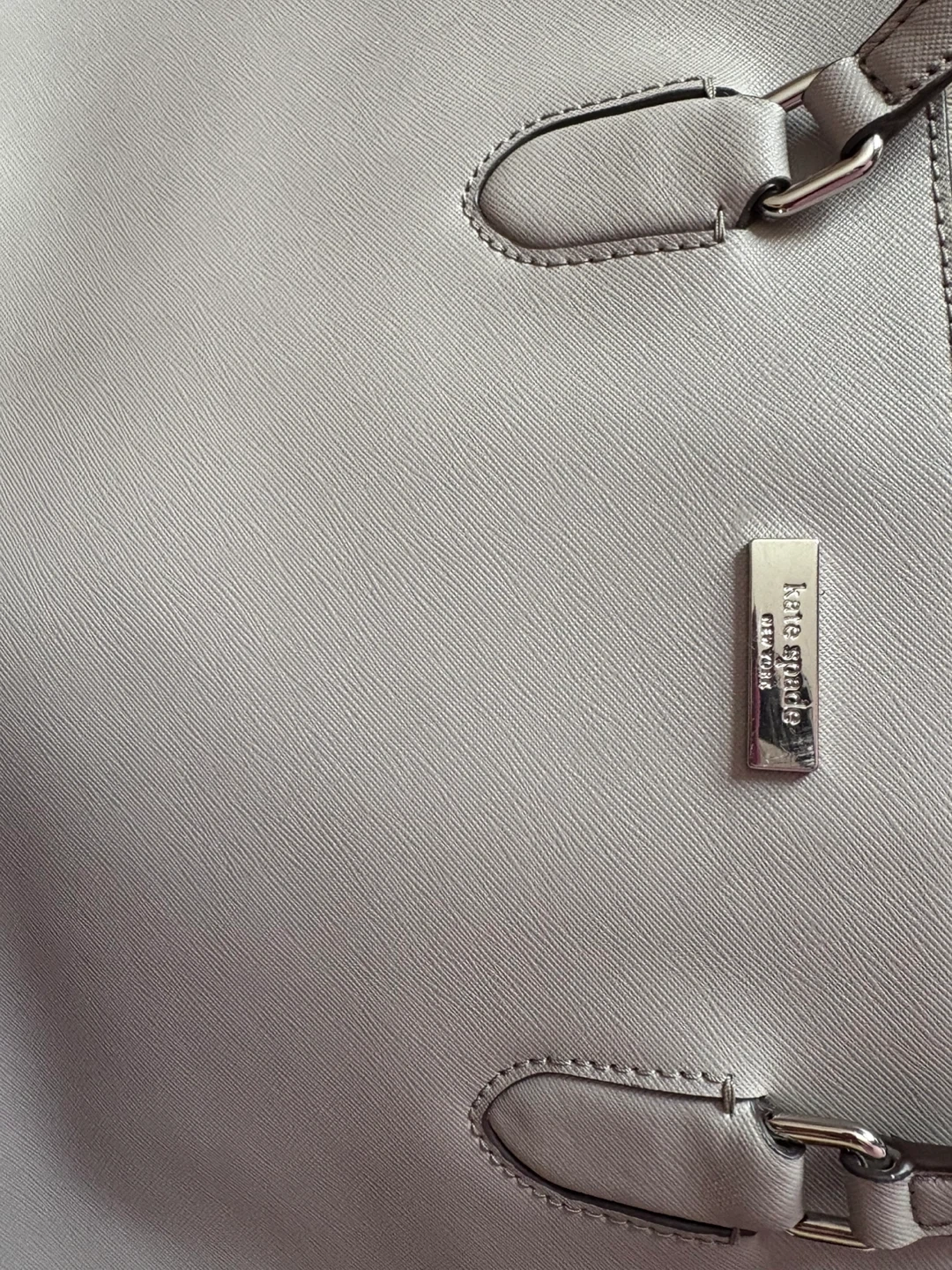 This is a light gray Kate Spade tote bag. It's in great condition and ready for a new owner! Perfect for carrying your everyday essentials in style and for to put your tablet or laptop with its padded protective lining.