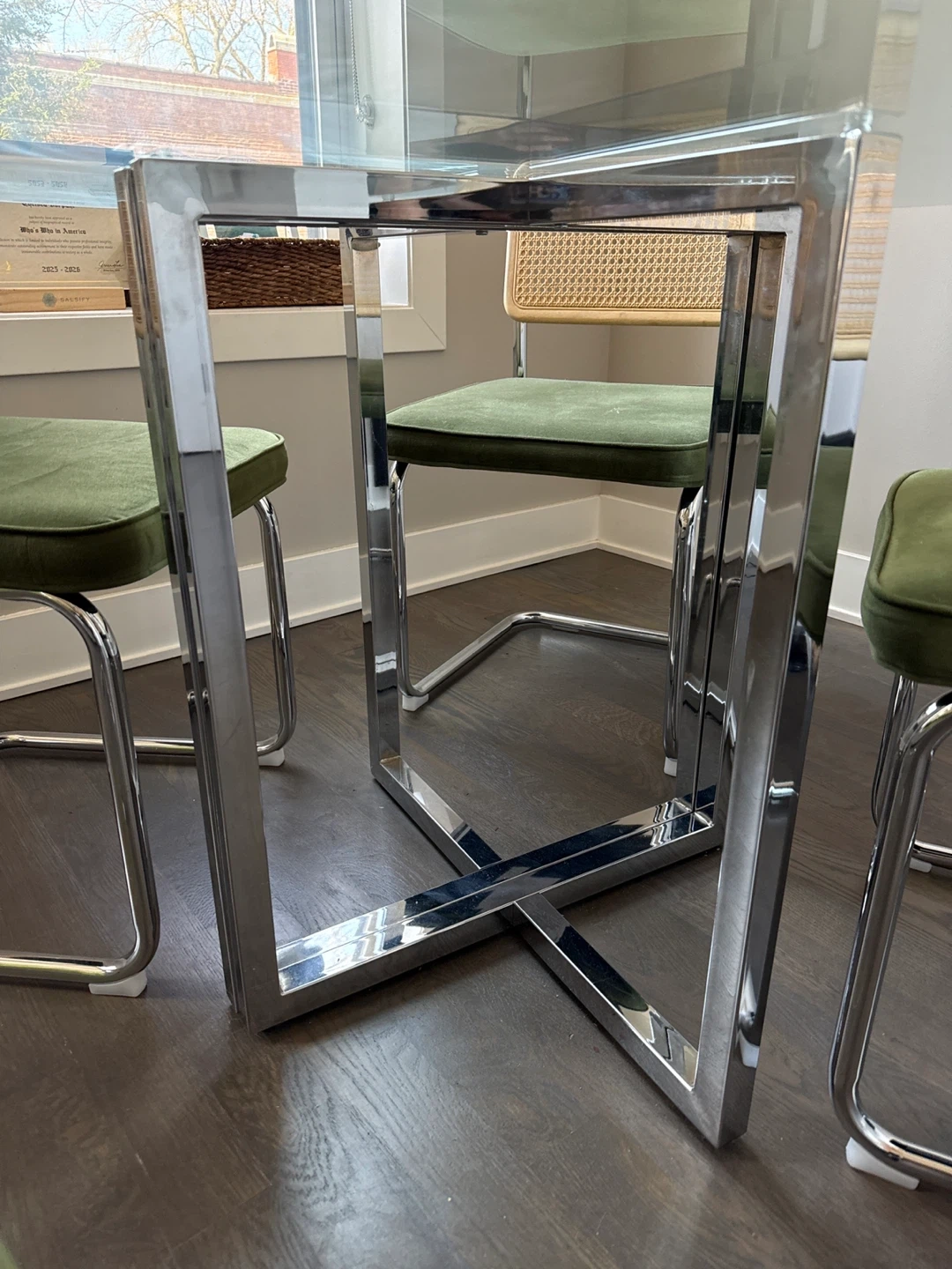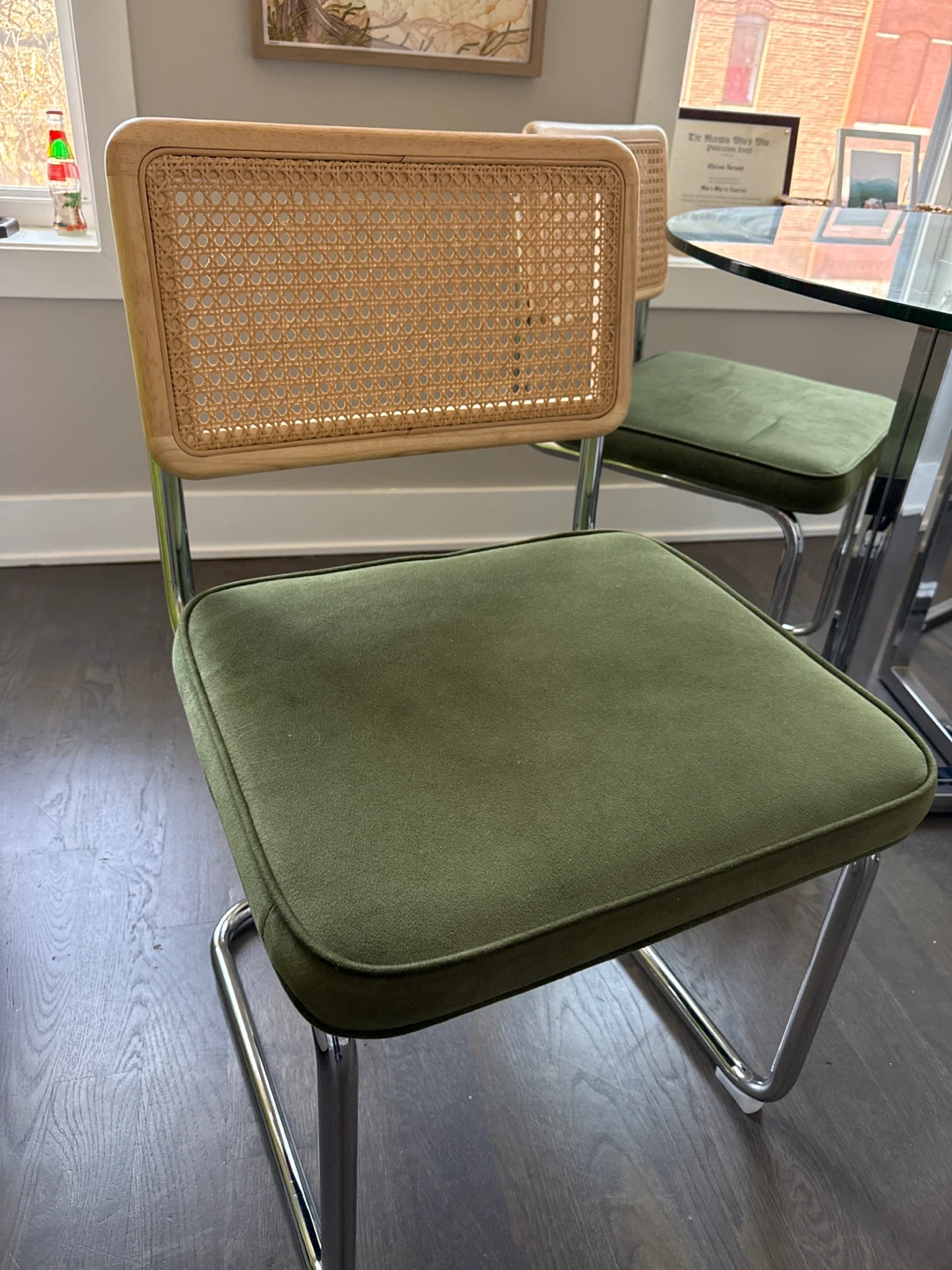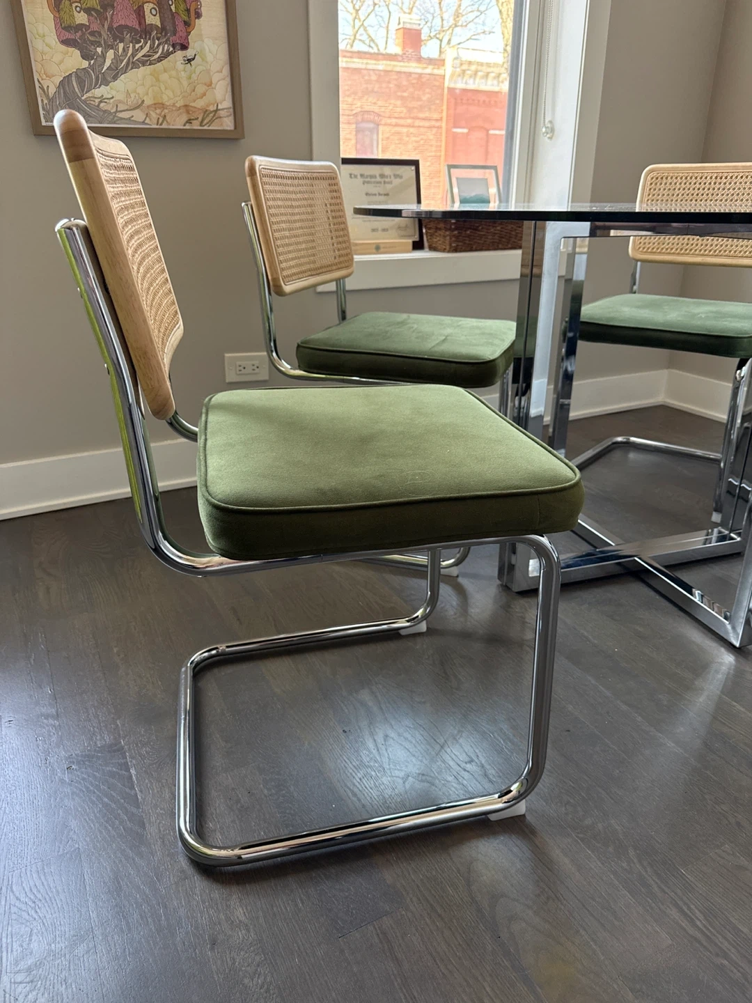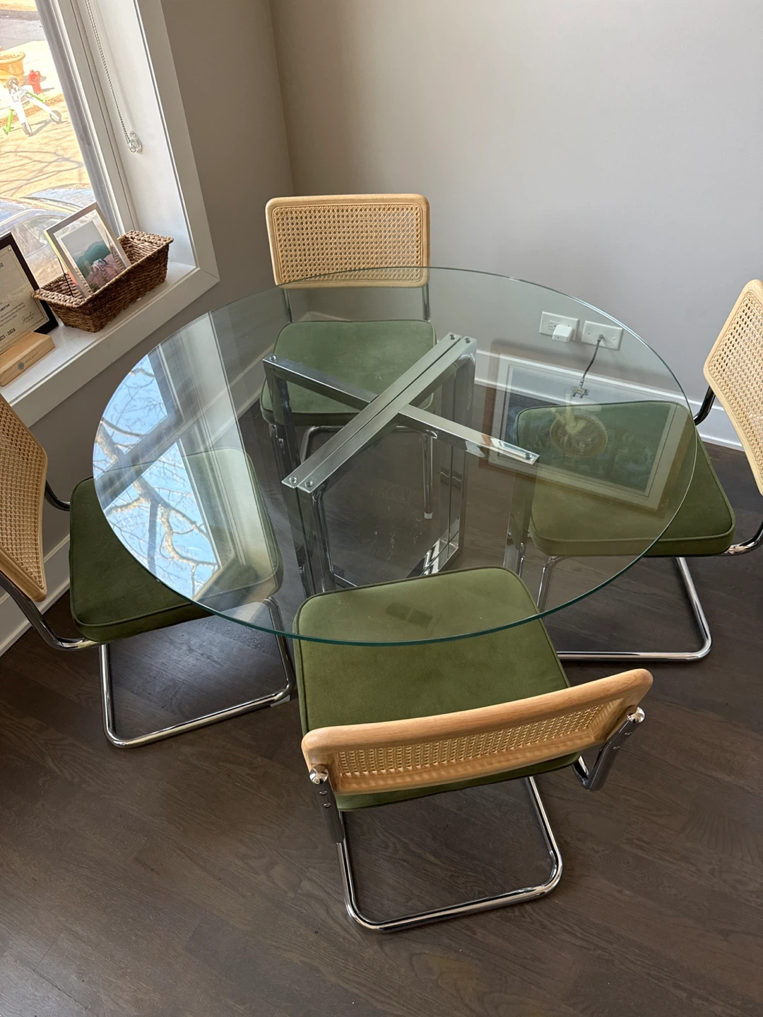 Round glass top dining table with a chrome base. Includes four dining chairs with chrome frames, dark green velvet cushions, and cane backs. Excellent condition!