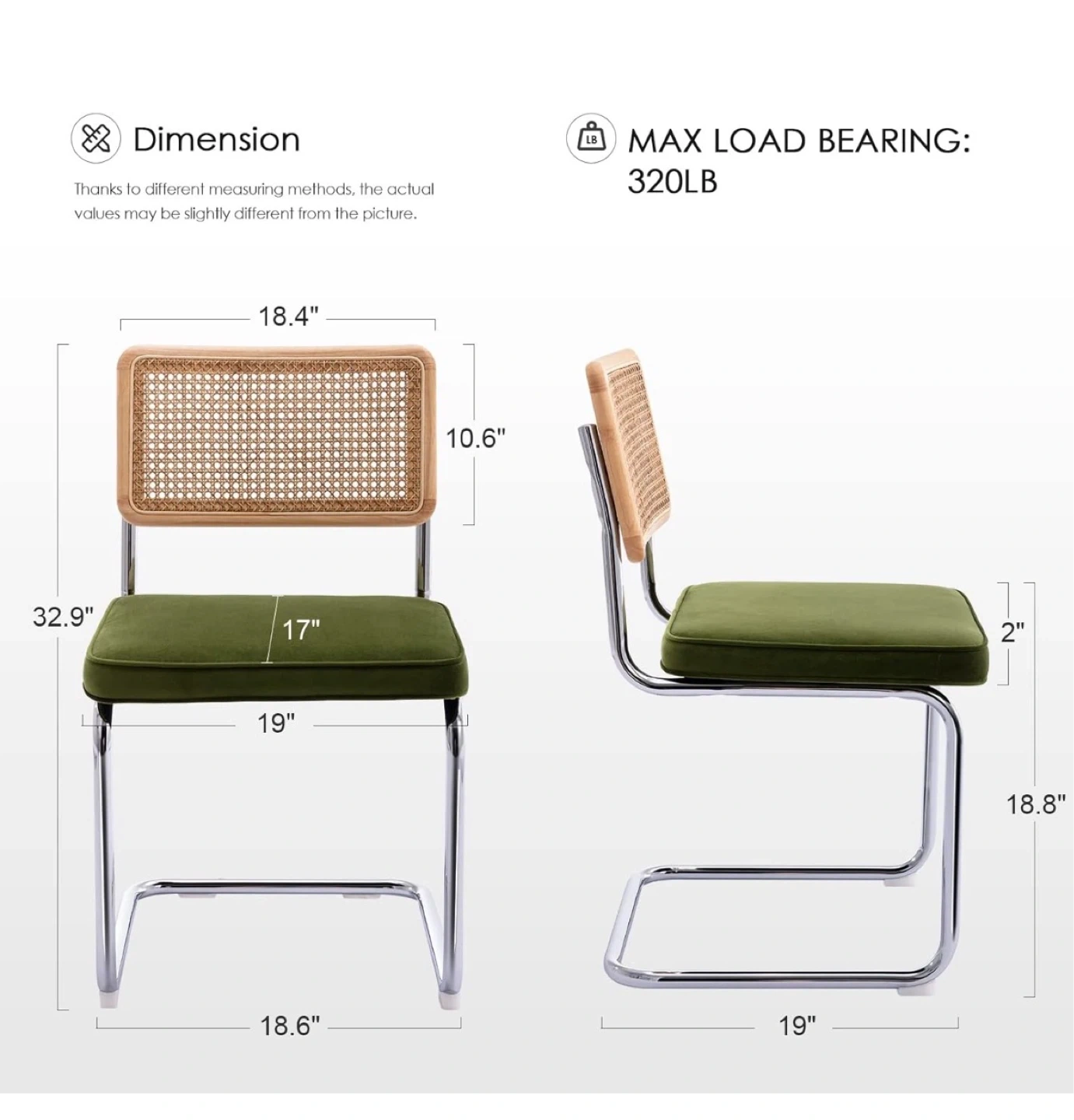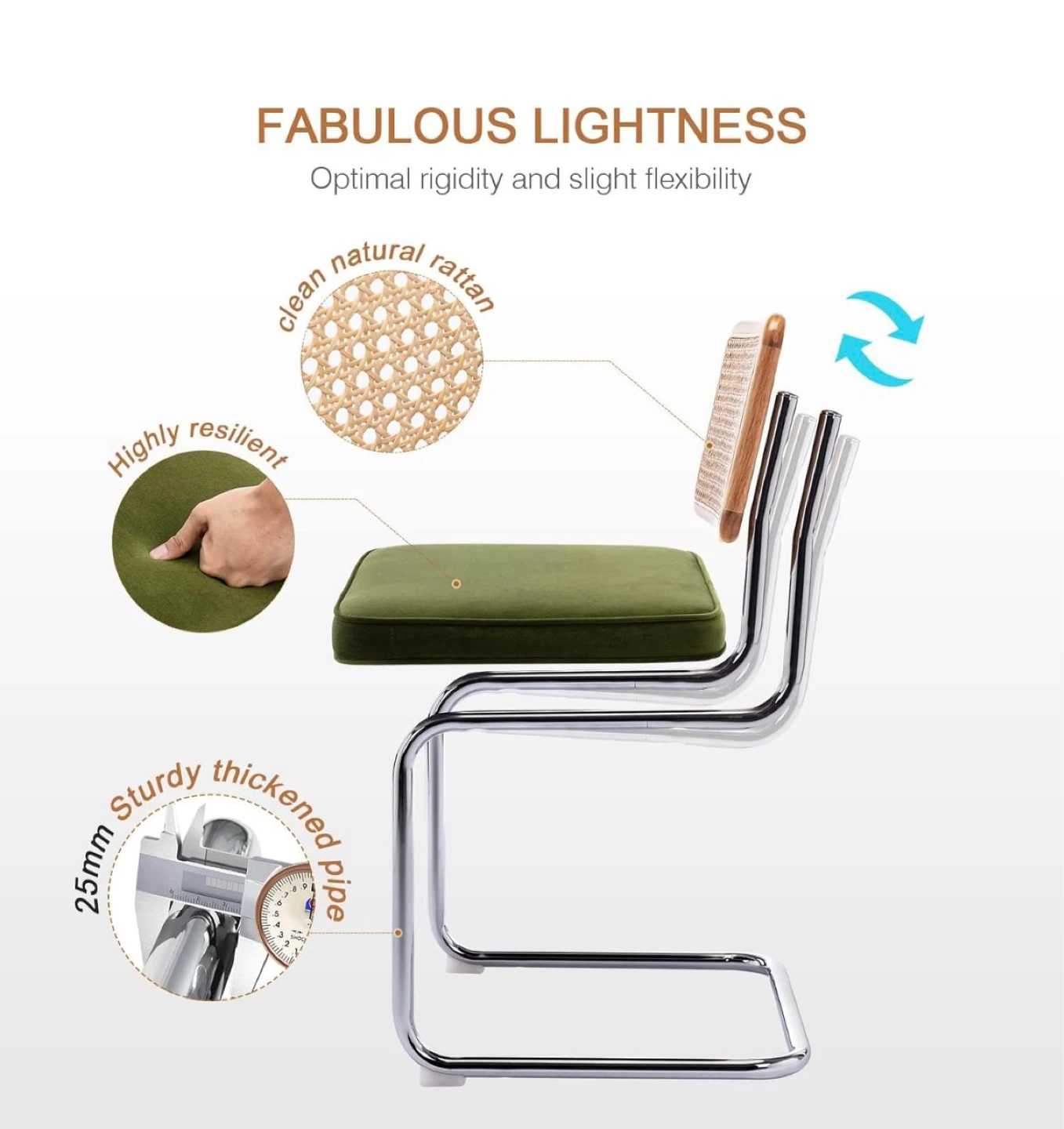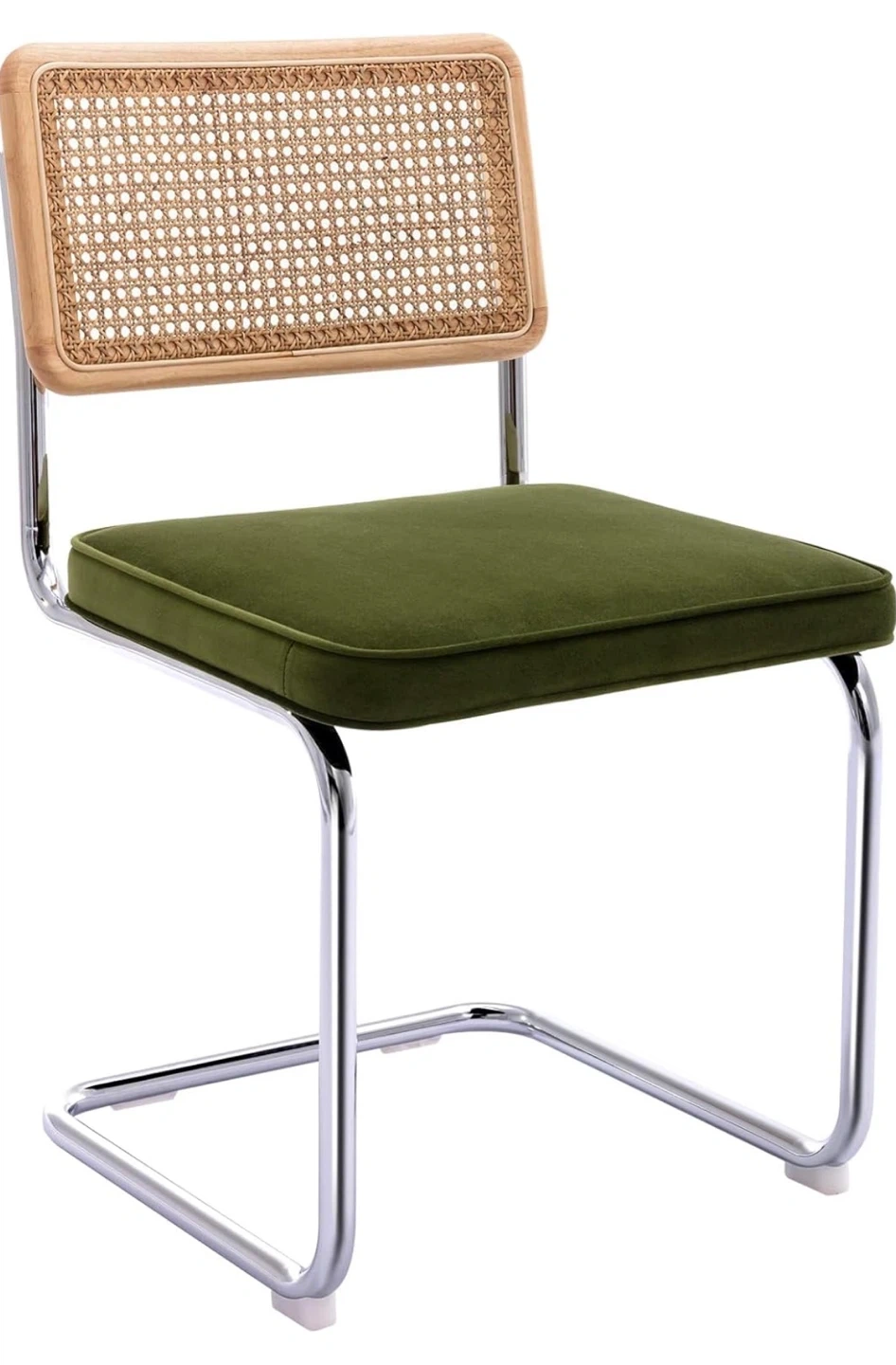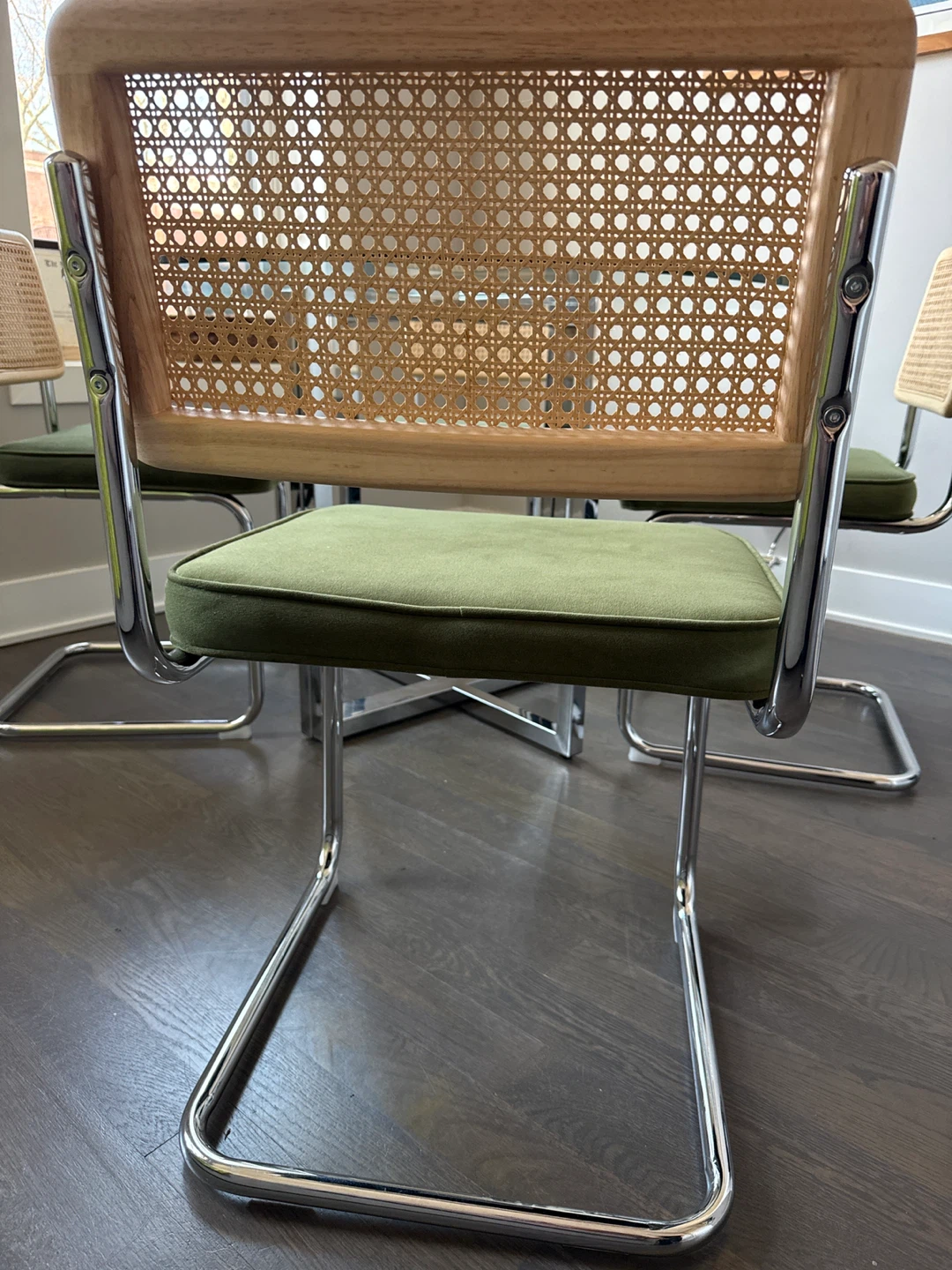 Round glass top dining table with a chrome base. Includes four dining chairs with chrome frames, dark green velvet cushions, and cane backs. Excellent condition!