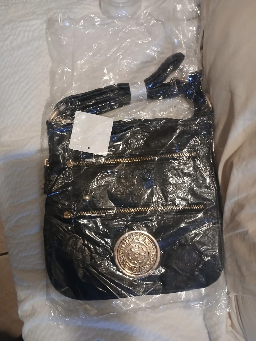 This black crossbody bag has a faux leather finish and gold-tone hardware. It features multiple zippered pockets for organization. It's perfect for everyday use!
