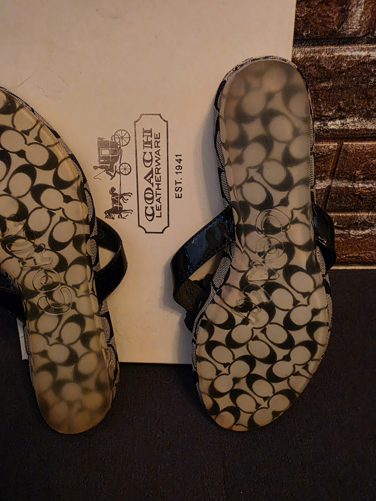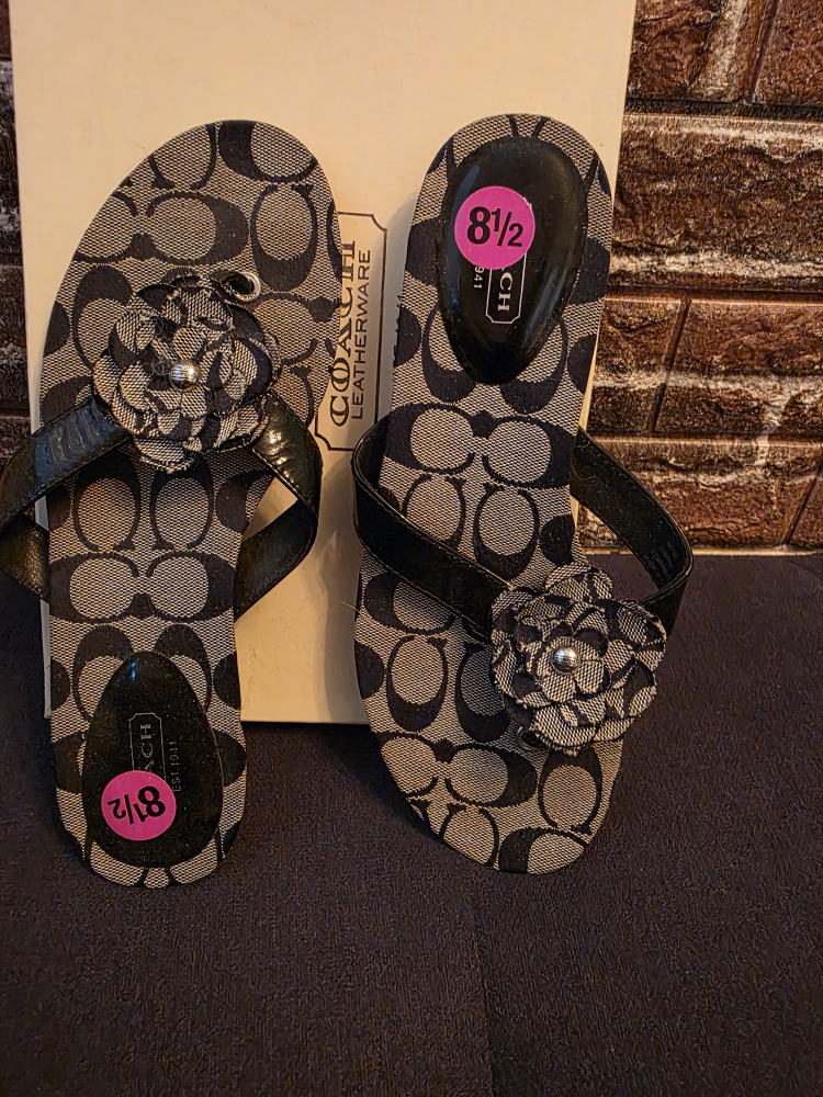 Cute Coach flip flops in size 8.5! They feature the classic Coach signature pattern and a sweet flower detail. Perfect for adding a touch of style to your casual outfits