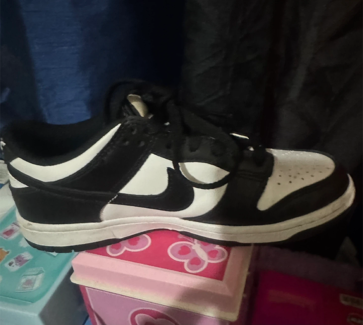 Classic Nike Dunk Low sneakers in a black and white colorway. These shoes feature a leather upper and rubber sole for durability. Low-top design for comfort and style.