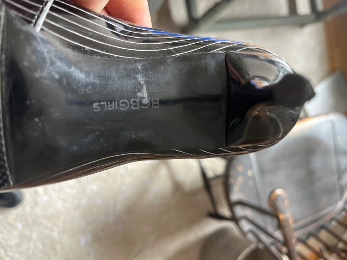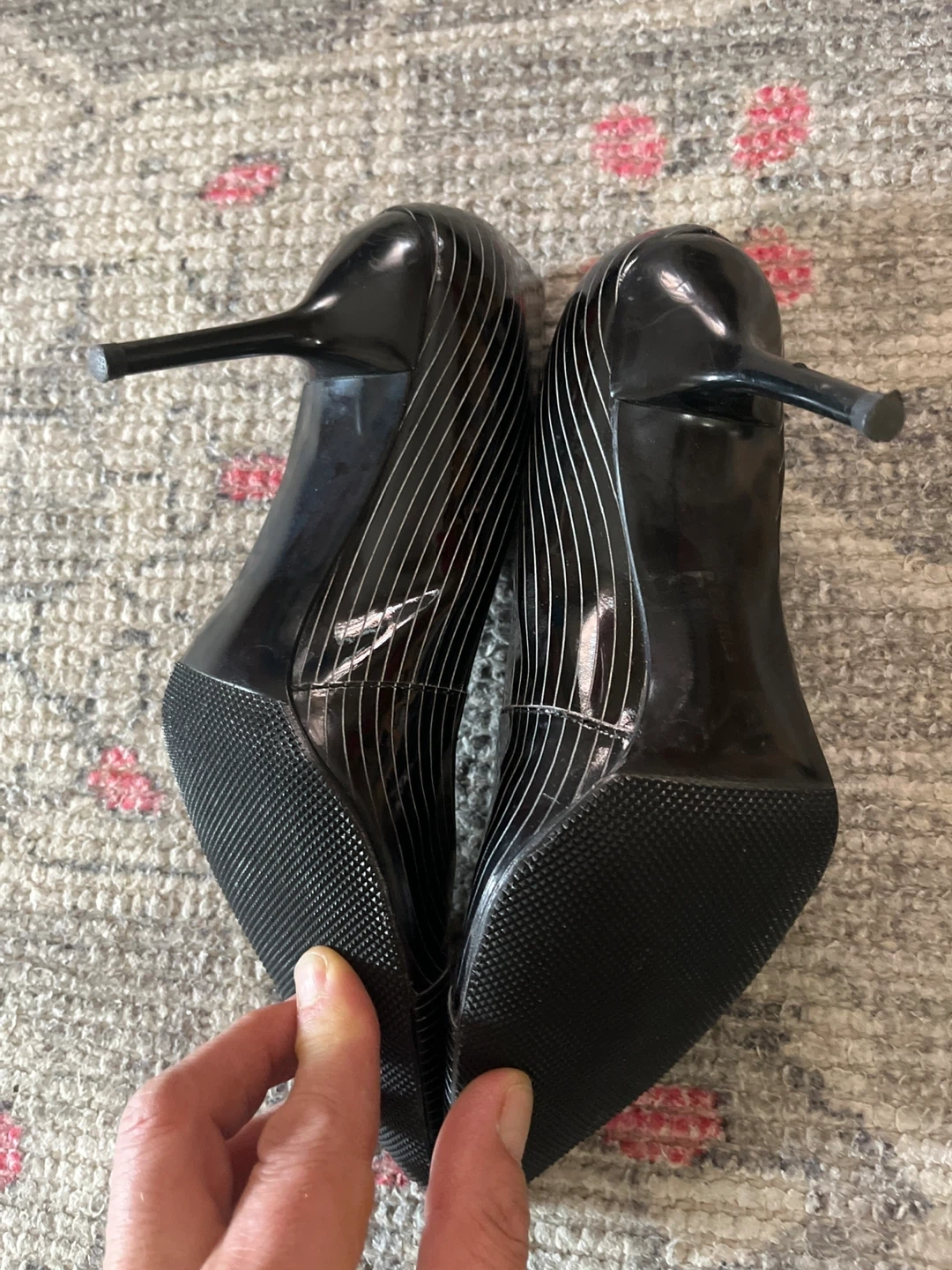BCBGirls Black Patent Heels with Silver Stripes