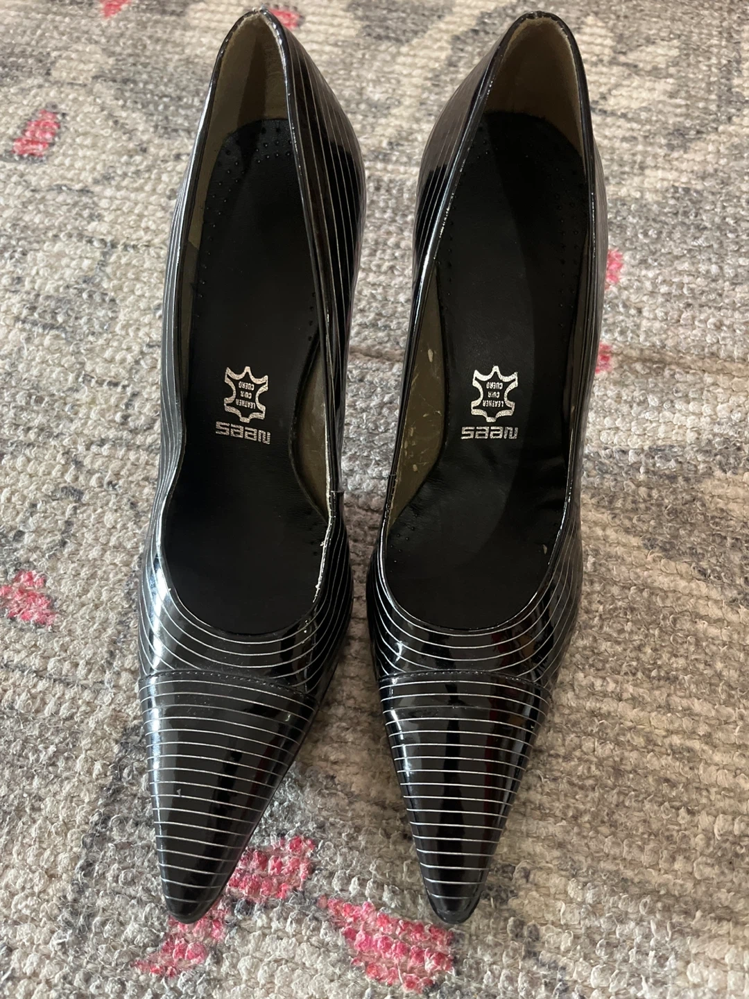 These BCBGirls heels are a shiny black patent material with silver stripe detailing. They're a classic pump style with a pointed toe and stiletto heel. Leather upper and lining.
