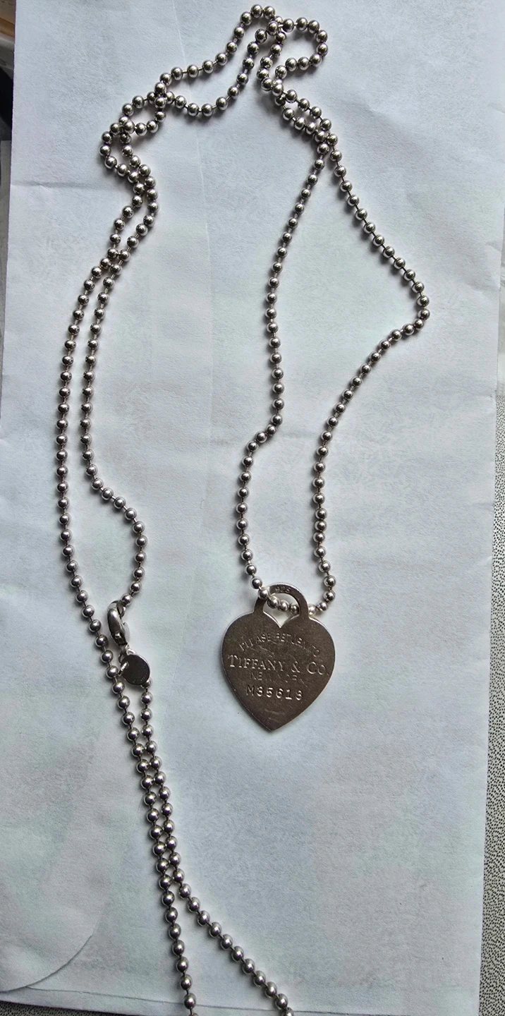 This is a Tiffany & Co. heart tag necklace. Sterling silver material. Features a ball chain with a lobster clasp closure.
