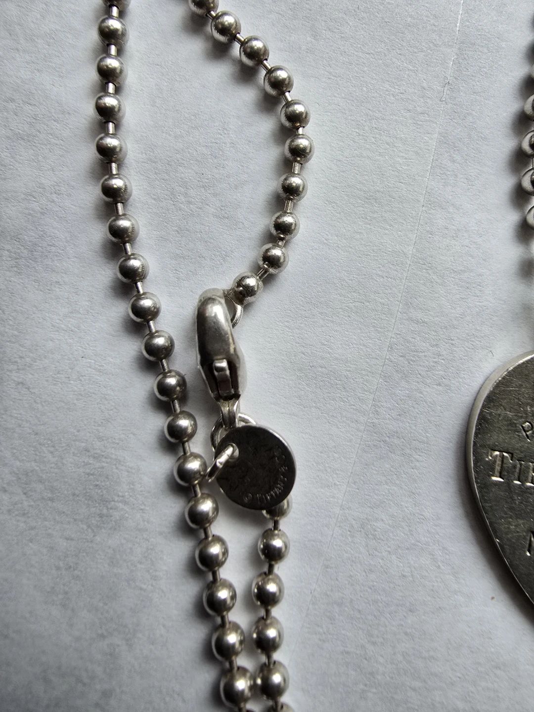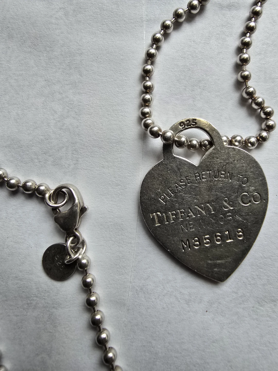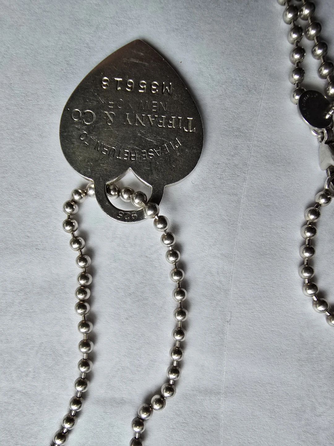 This is a Tiffany & Co. heart tag necklace. Sterling silver material. Features a ball chain with a lobster clasp closure.