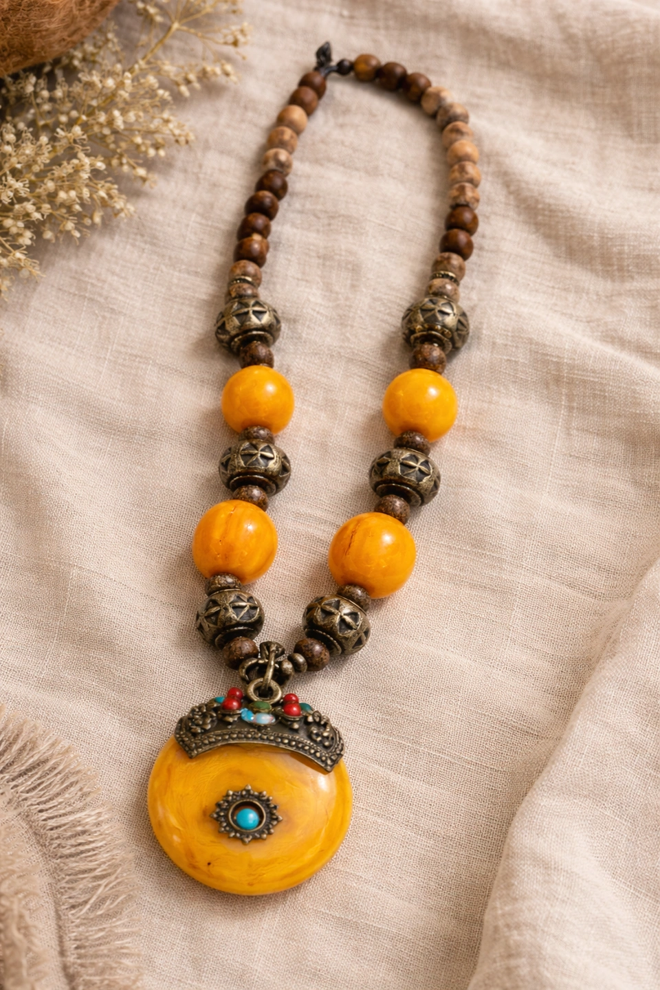 A striking vintage statement necklace featuring a large golden-yellow faux amber resin pendant, accented with ornate brass-tone metalwork and turquoise- and coral-tone cabochon details. This piece embodies classic 1970s bohemian style with ethnic and tribal revival influences. The necklace is composed of hand-strung beads including warm resin elements, carved metal spacers, and natural wood beads, creating a rich, earthy color palette. Finished with an original vintage hook clasp, showing authentic age and patina consistent with a well-loved vintage piece. Era: Vintage, likely 1960s–1970s. Materials: Faux amber resin, brass-tone metal, wood beads, faux turquoise & coral accents. Necklace length: approx. 12–13 inches drop (see photos with tape measure). Pendant size: approx. 2 inches. Closure: Original vintage hook clasp. Good vintage condition with natural patina and age-appropriate wear.