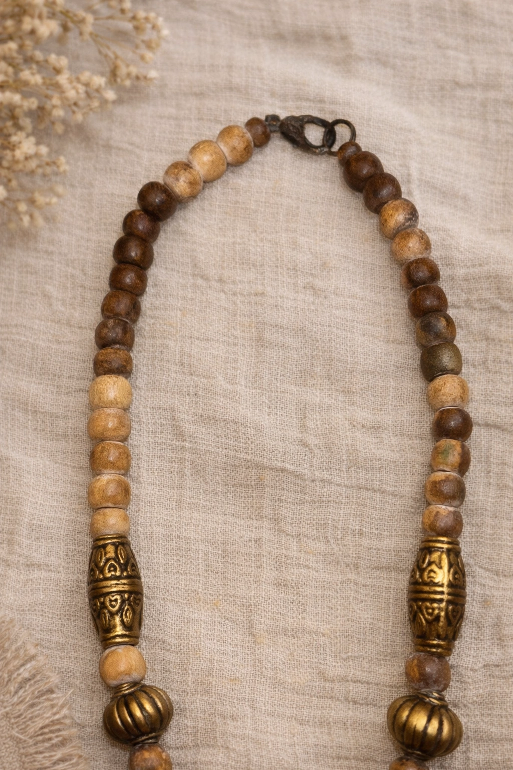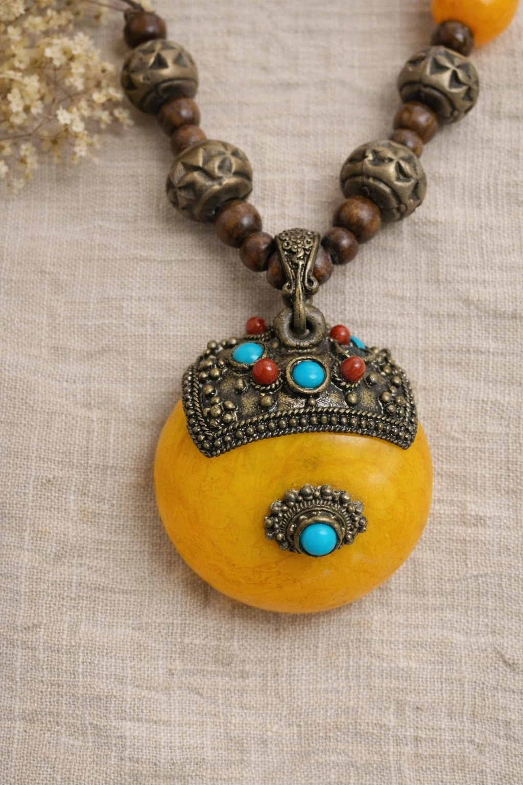 A striking vintage statement necklace featuring a large golden-yellow faux amber resin pendant, accented with ornate brass-tone metalwork and turquoise- and coral-tone cabochon details. This piece embodies classic 1970s bohemian style with ethnic and tribal revival influences. The necklace is composed of hand-strung beads including warm resin elements, carved metal spacers, and natural wood beads, creating a rich, earthy color palette. Finished with an original vintage hook clasp, showing authentic age and patina consistent with a well-loved vintage piece. Era: Vintage, likely 1960s–1970s. Materials: Faux amber resin, brass-tone metal, wood beads, faux turquoise & coral accents. Necklace length: approx. 12–13 inches drop (see photos with tape measure). Pendant size: approx. 2 inches. Closure: Original vintage hook clasp. Good vintage condition with natural patina and age-appropriate wear.
