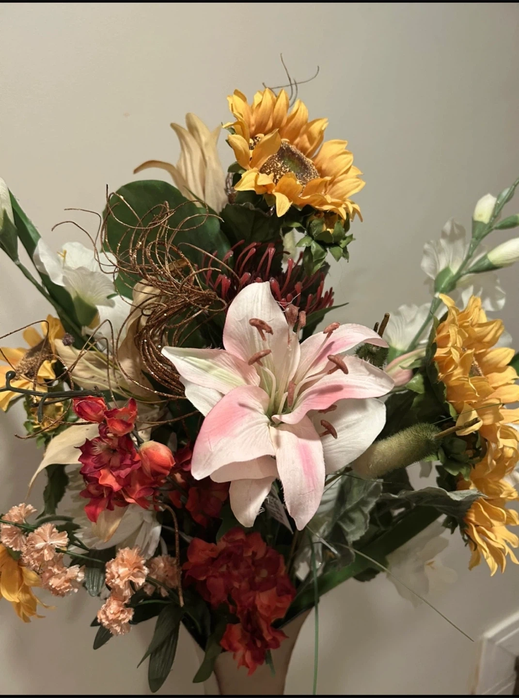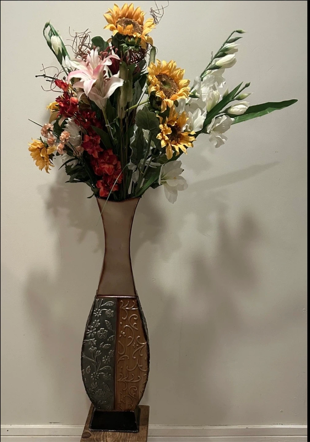 Selling a decorative vase that comes with artificial flowers. It's a nice piece to add to any room for a pop of color and design. The vase has a unique pattern and the flowers are a mix of different colors and types. It's in great condition and ready to brighten up your space!