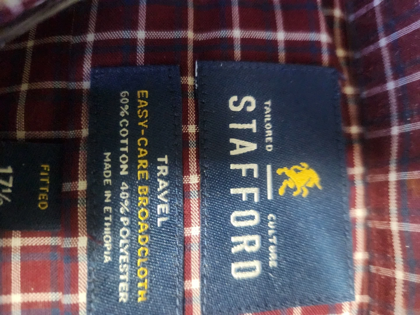 Stafford Easy-Care Broadcloth dress shirt. It's a fitted style with stretch. Made with 60% cotton and 40% polyester. Machine washable and little to no iron needed!