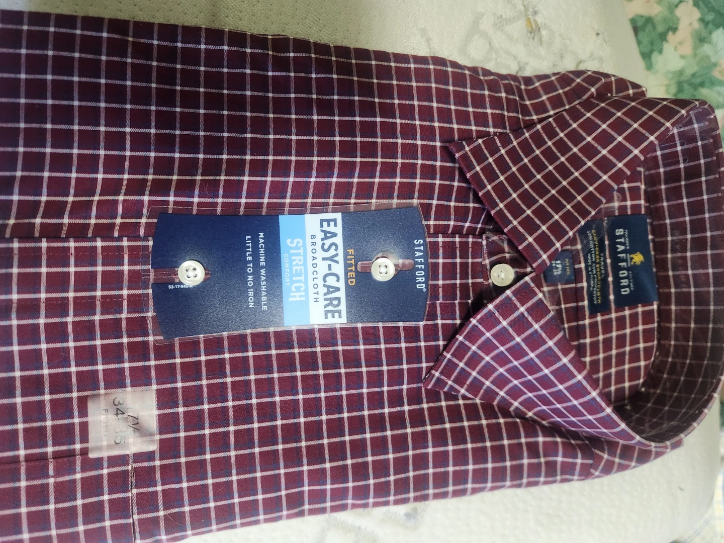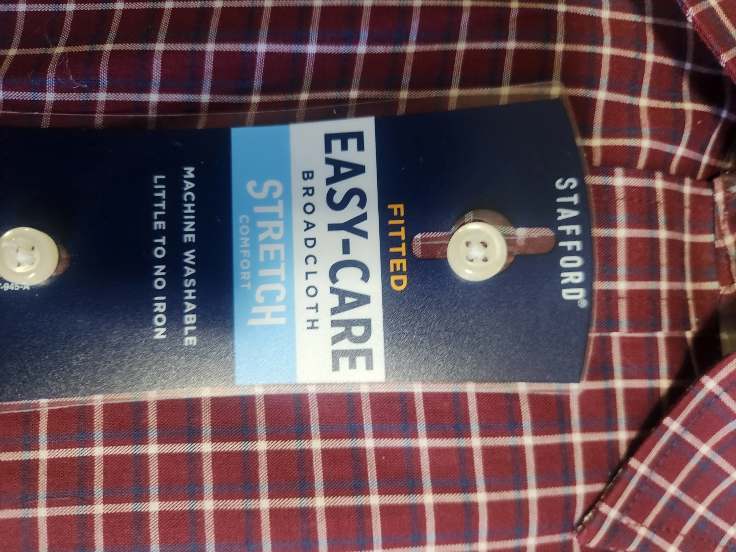 Stafford Easy-Care Broadcloth dress shirt. It's a fitted style with stretch. Made with 60% cotton and 40% polyester. Machine washable and little to no iron needed!