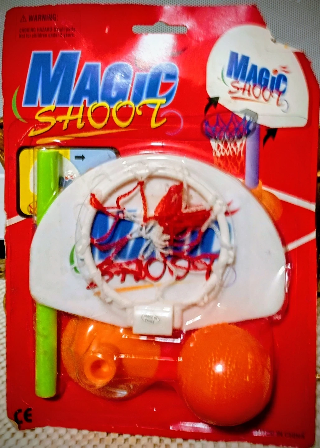 Selling a Magic Shoot basketball toy, still in its original packaging! It includes a small basketball hoop, a ball, and a launcher. Perfect for kids! 3 years old & up.