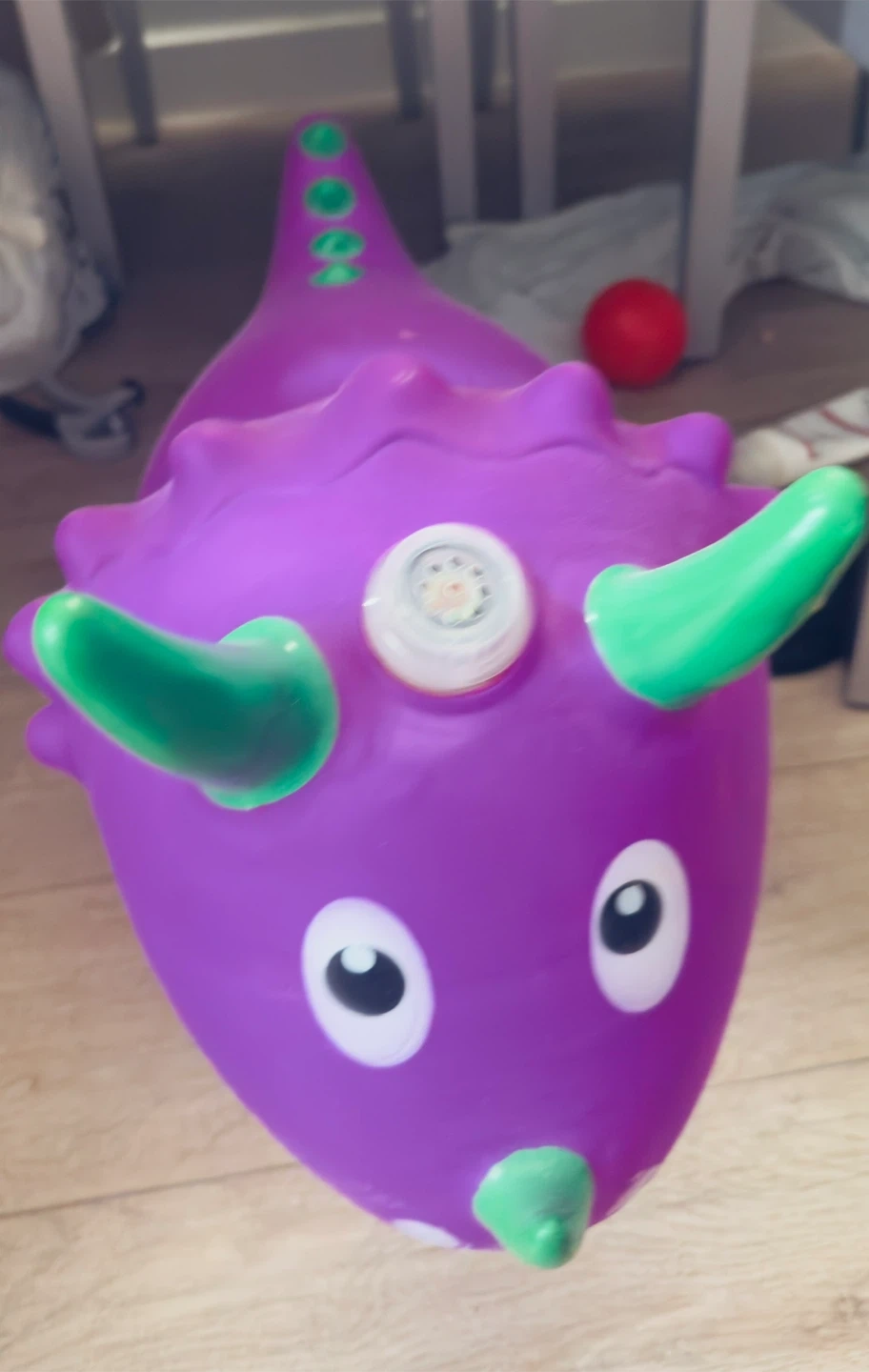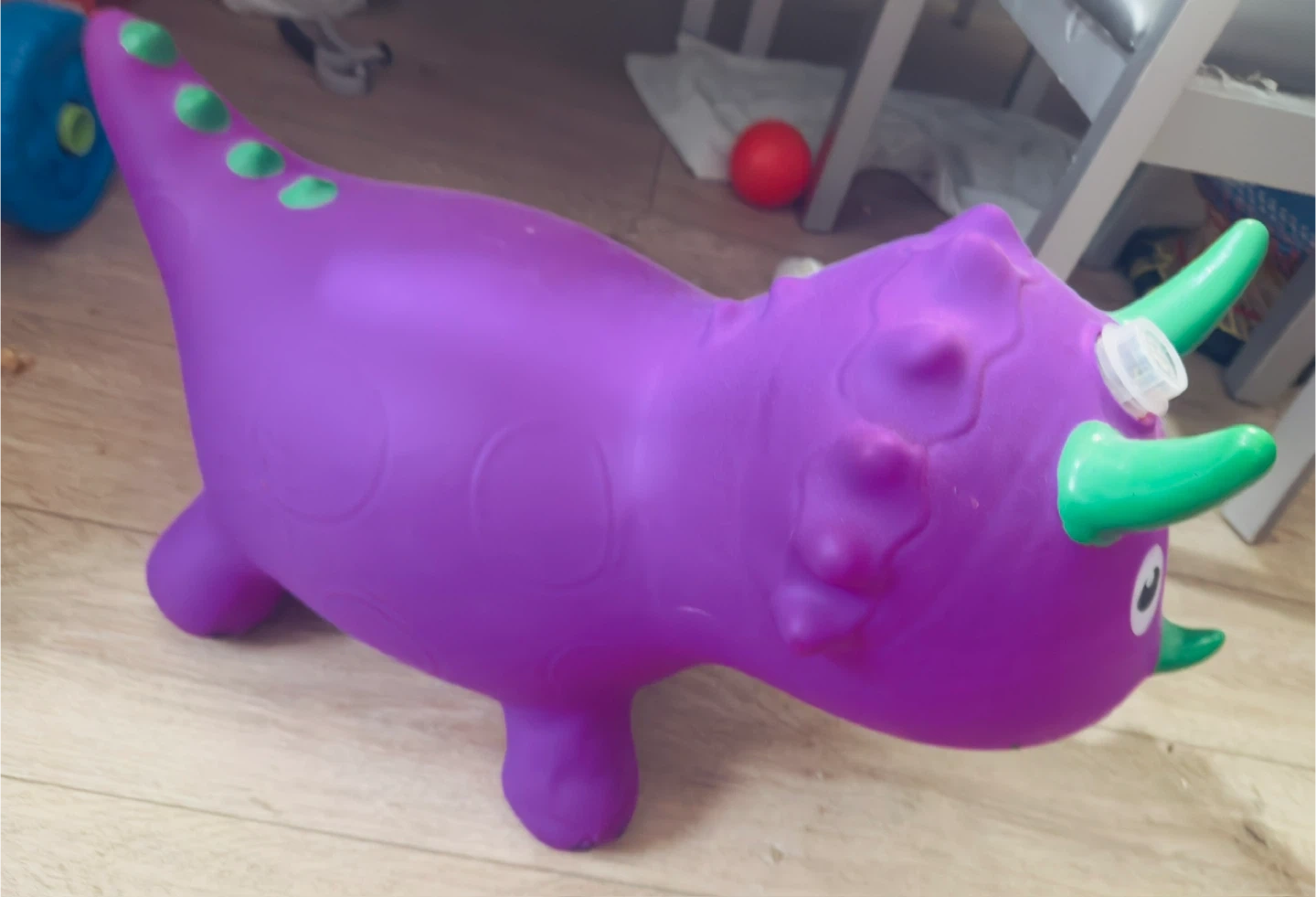 Here's a fun purple dinosaur bouncy toy! It has green accents and is in great condition. Perfect for kids who love to bounce around and have some active fun