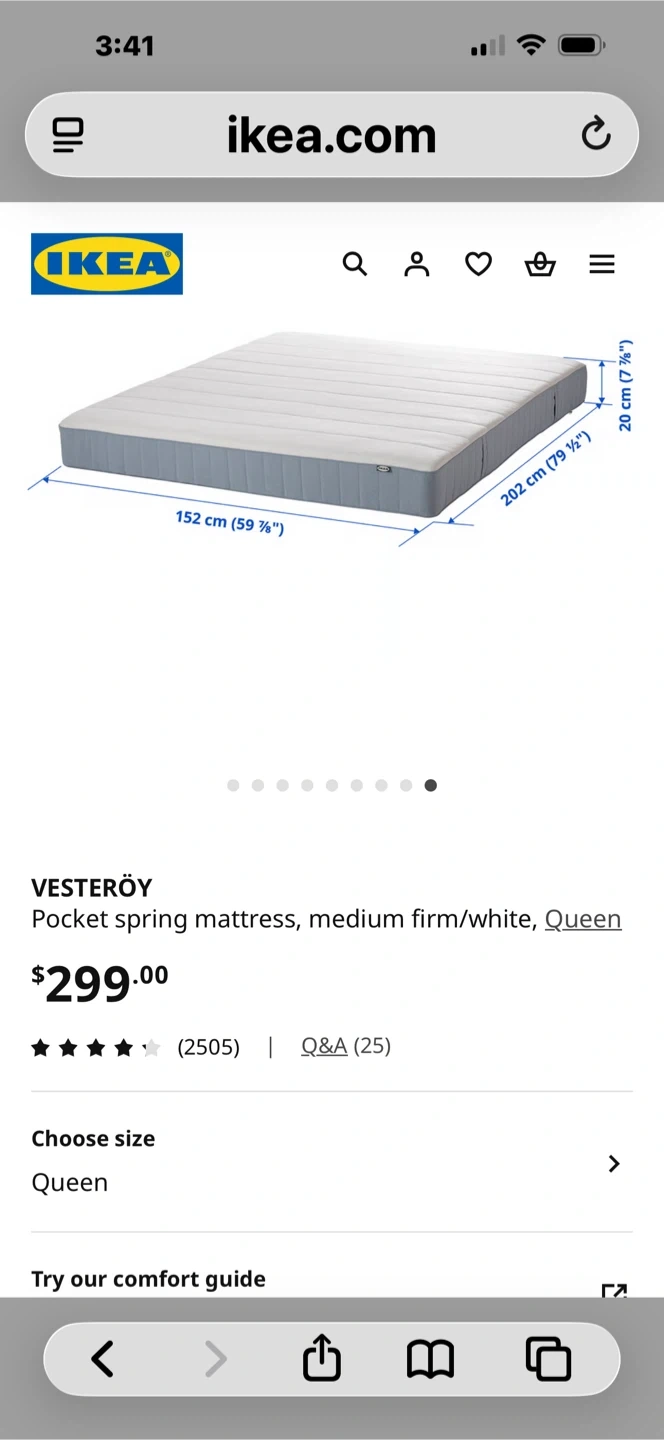 IKEA VESTERÖY pocket spring mattress in queen size. It's medium firm and white. Dimensions are 152 cm (59 1/2") wide by 202 cm (79 1/2") long and 20 cm (7 7/8") thick. This mattress is in a protective plastic wrap.