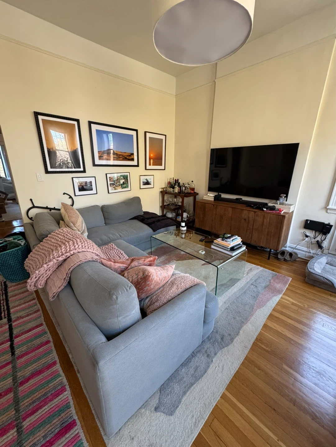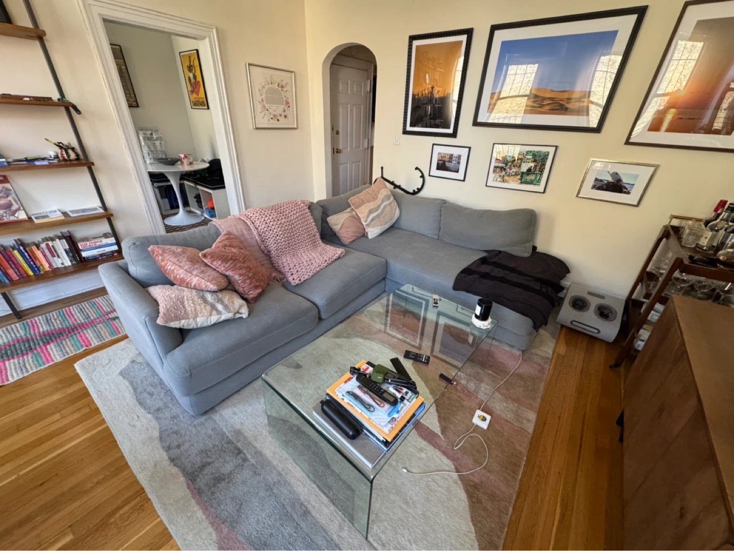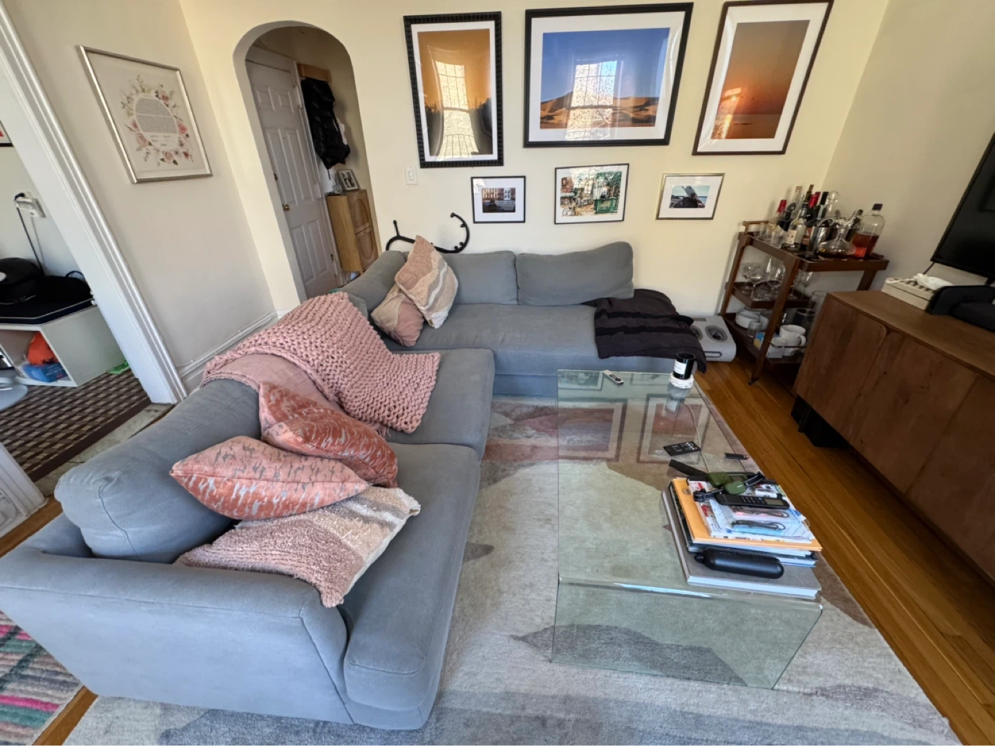 Comfortable grey sectional sofa. Would take this with me if I could! Two pieces - fits 4 comfortably and can squeeze even more.