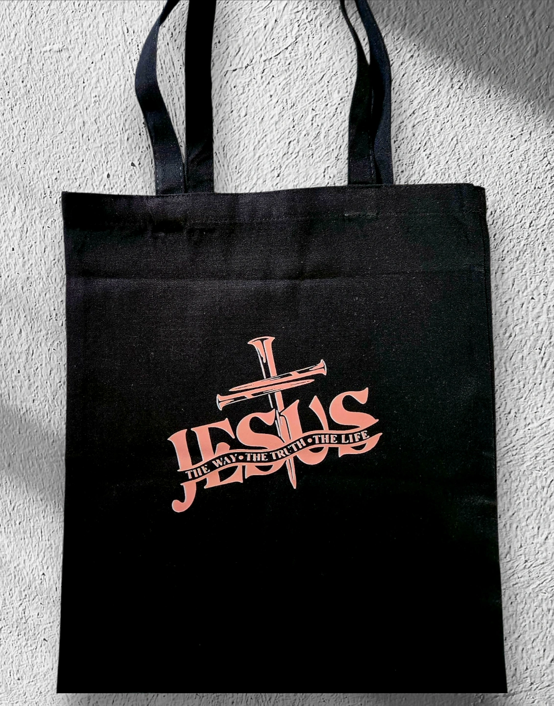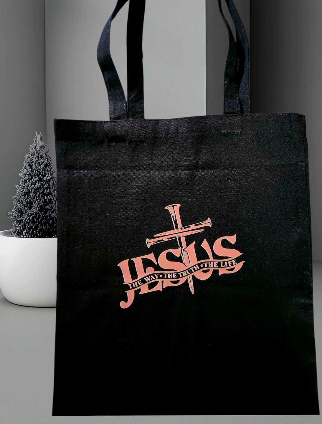Black tote bag. Features a design of a cross and the word Jesus. The phrases "The Way", "The Truth", and "The Life" are included. This bag is great for carrying items while you go to church, too everyday use π π π