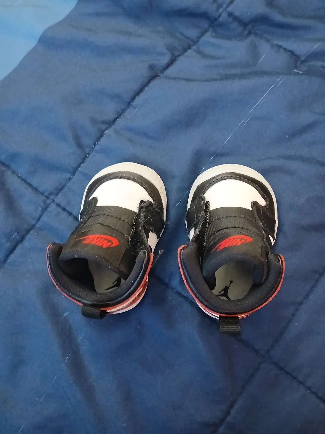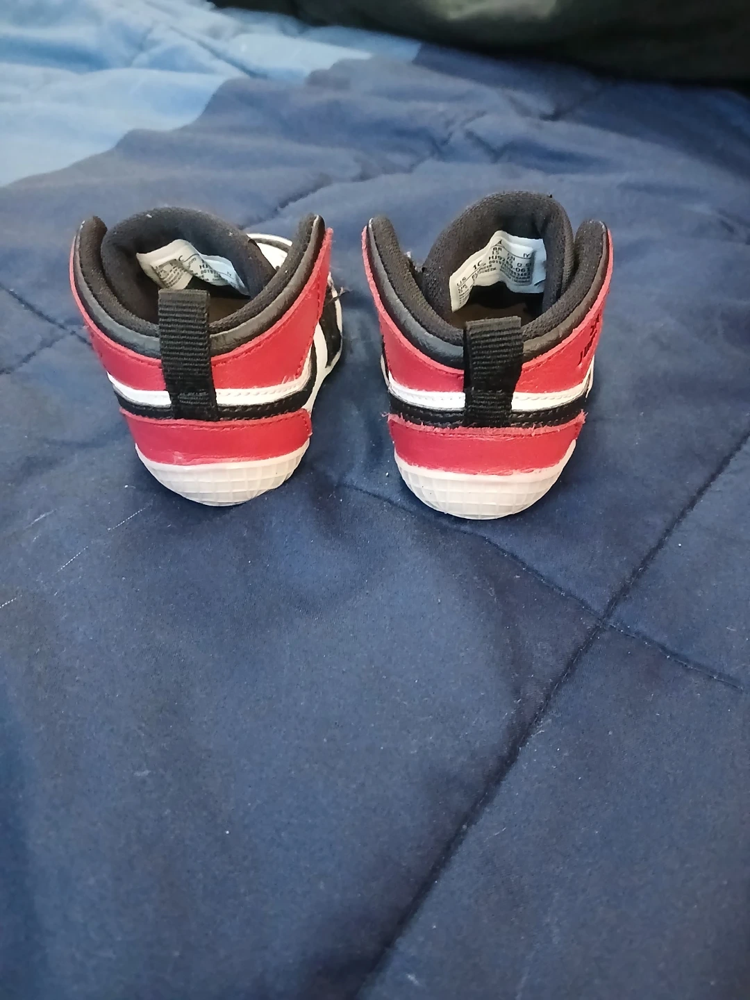 These baby Jordan crib shoes are designed for little ones. They feature a classic high-top silhouette in red, black, and white. Easy on and off with pull tabs.