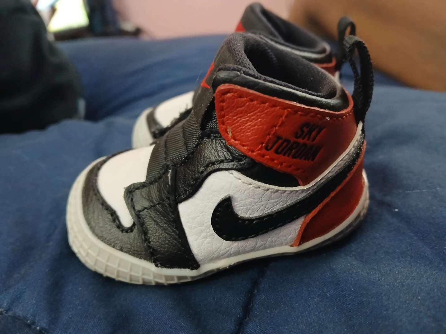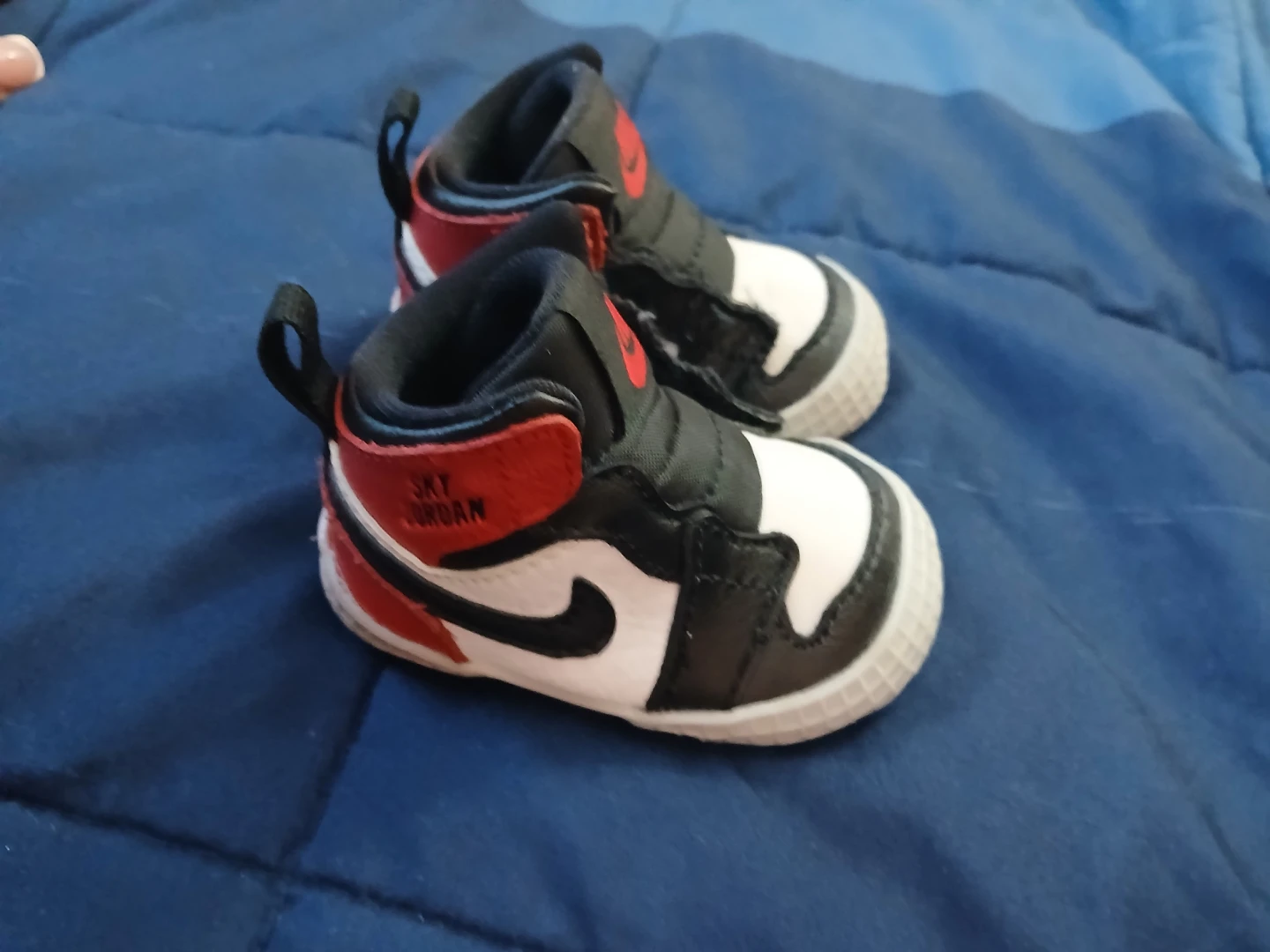 These baby Jordan crib shoes are designed for little ones. They feature a classic high-top silhouette in red, black, and white. Easy on and off with pull tabs.
