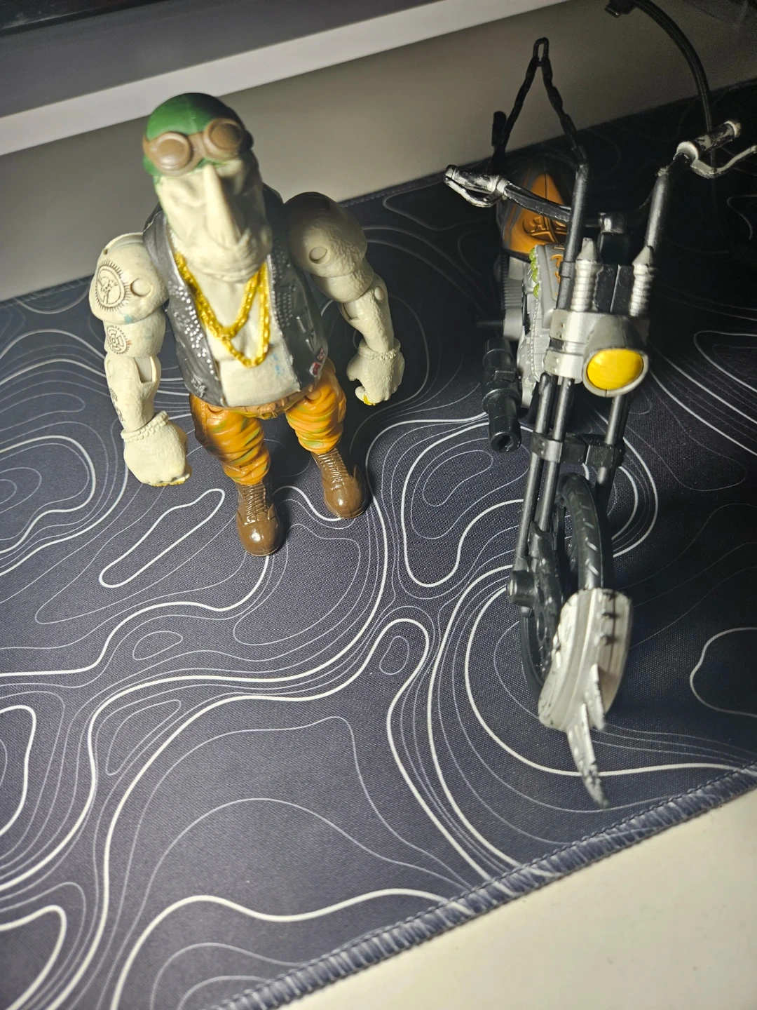 Baxter Stockman action figure with his motorbike. Figure is detailed with accessories including a vest and gold chain. The motorbike features a yellow headlight. Great for collectors!