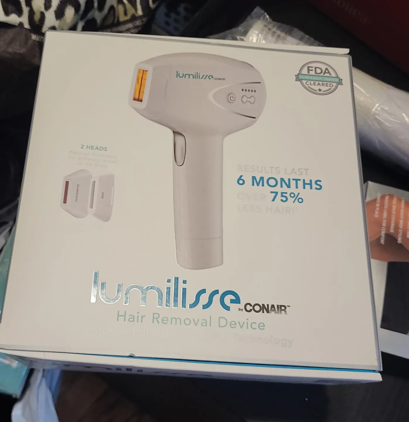 Selling a Lumilisse by Conair hair removal device! The box says it has two heads for optimal treatment of different areas of the body. It uses Intense Pulsed Light (IPL) technology. The box also boasts results that last 6 months with over 75% less hair!
