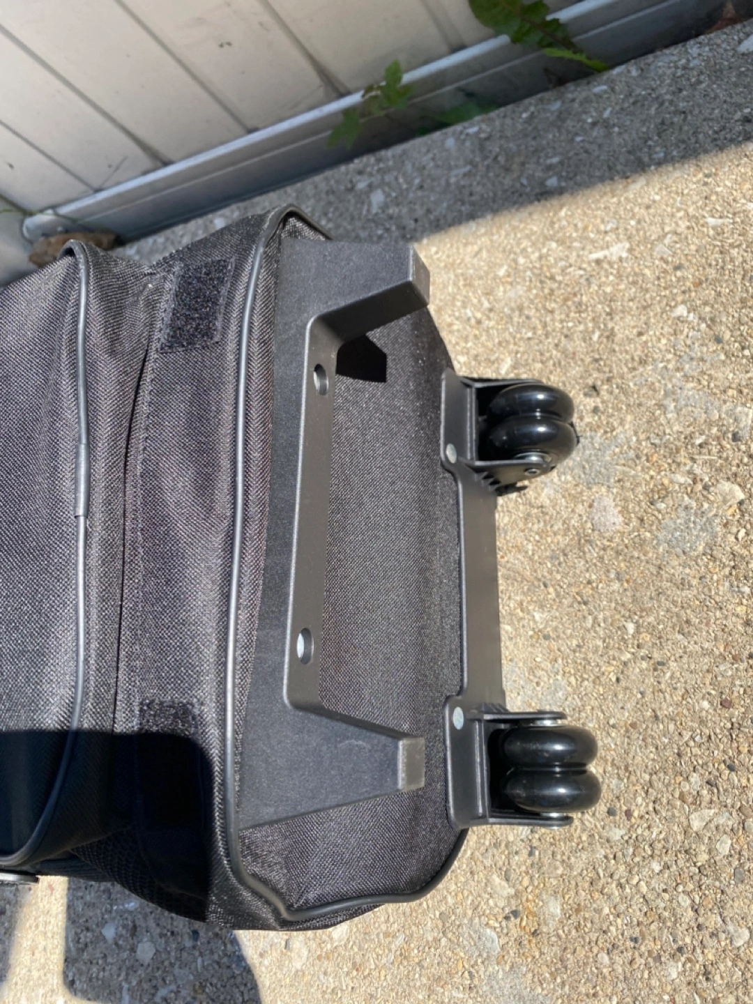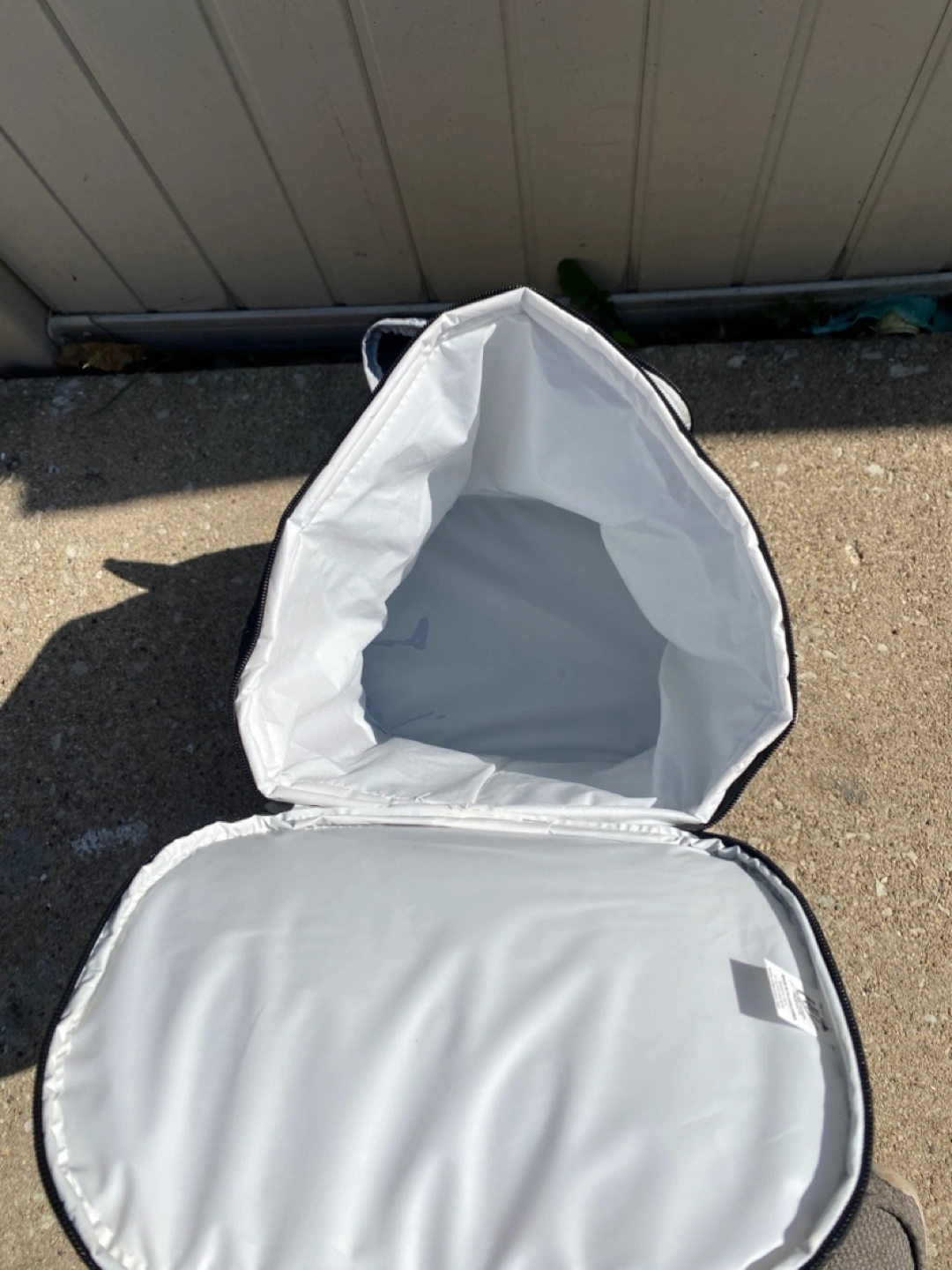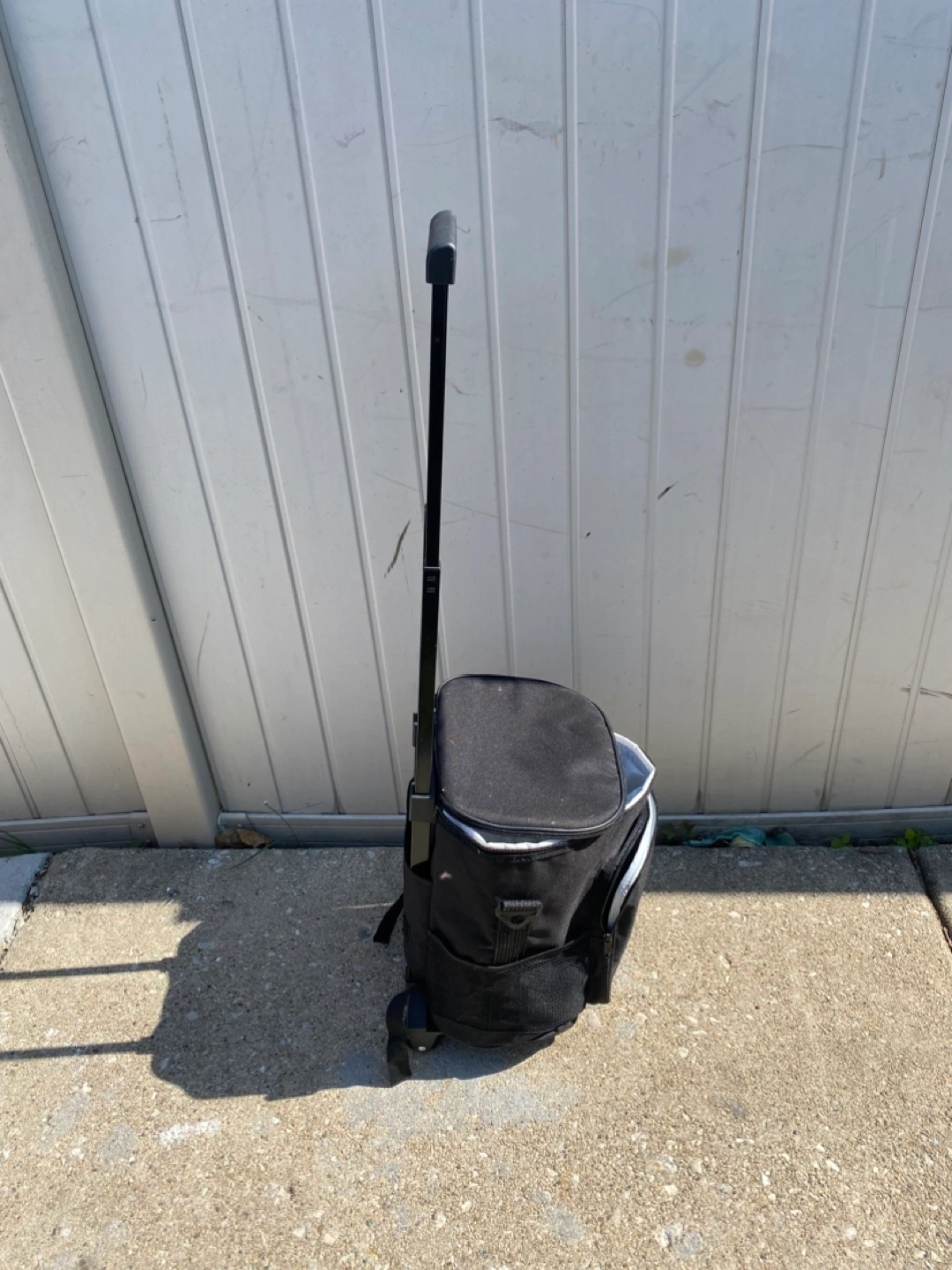 Black fabric bag with wheels, a retractable handle, and a front pocket. Inside, a light-colored insulated interior. A great item to bring along to relax and enjoy a picnic.