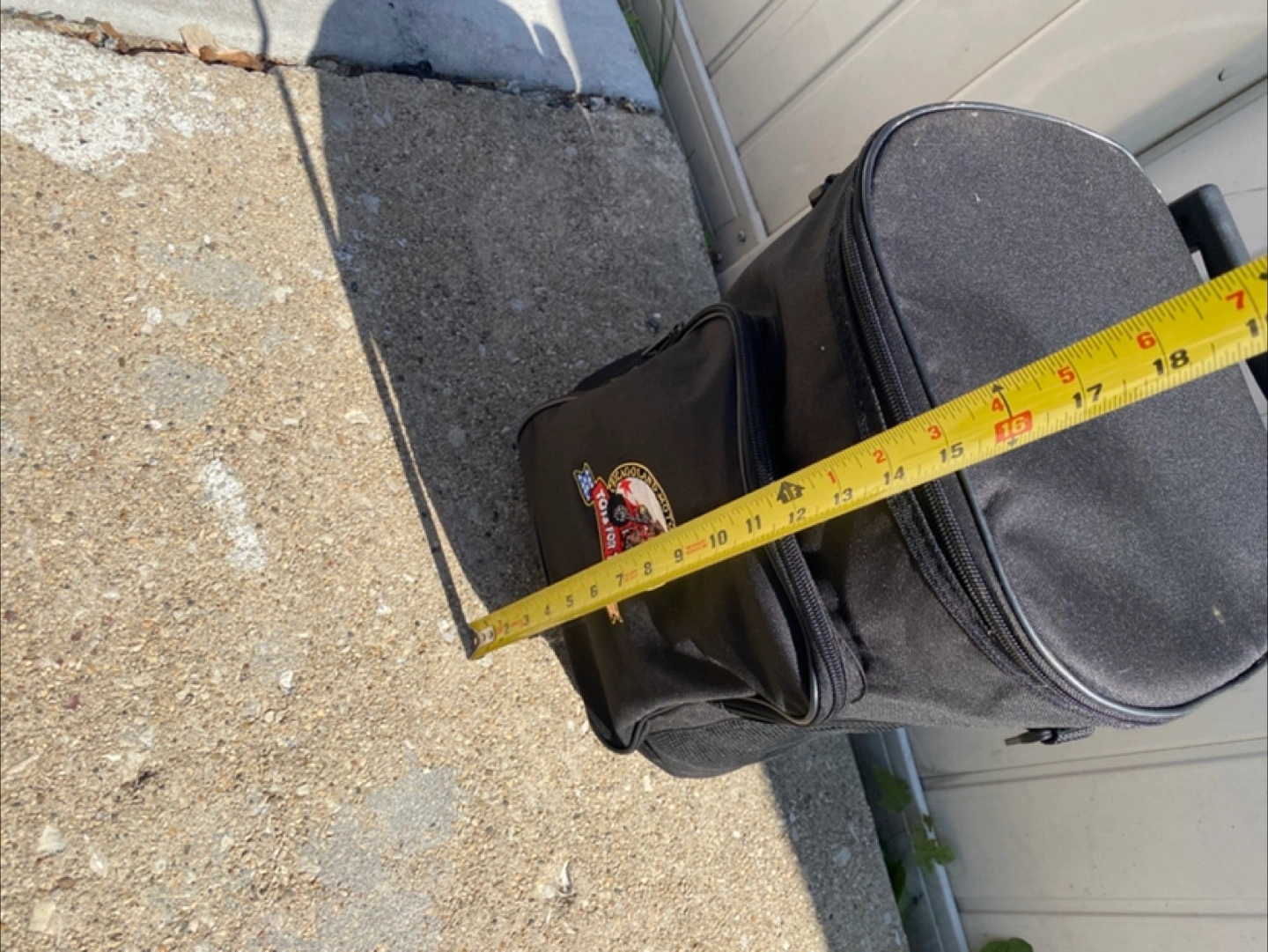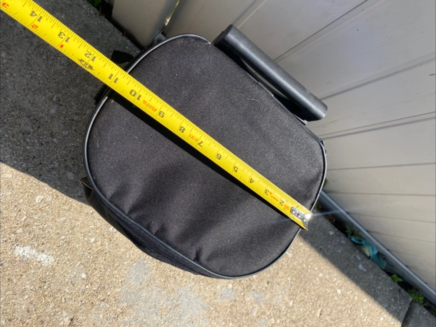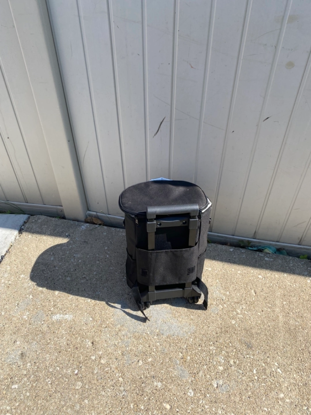 Black fabric bag with wheels, a retractable handle, and a front pocket. Inside, a light-colored insulated interior. A great item to bring along to relax and enjoy a picnic.