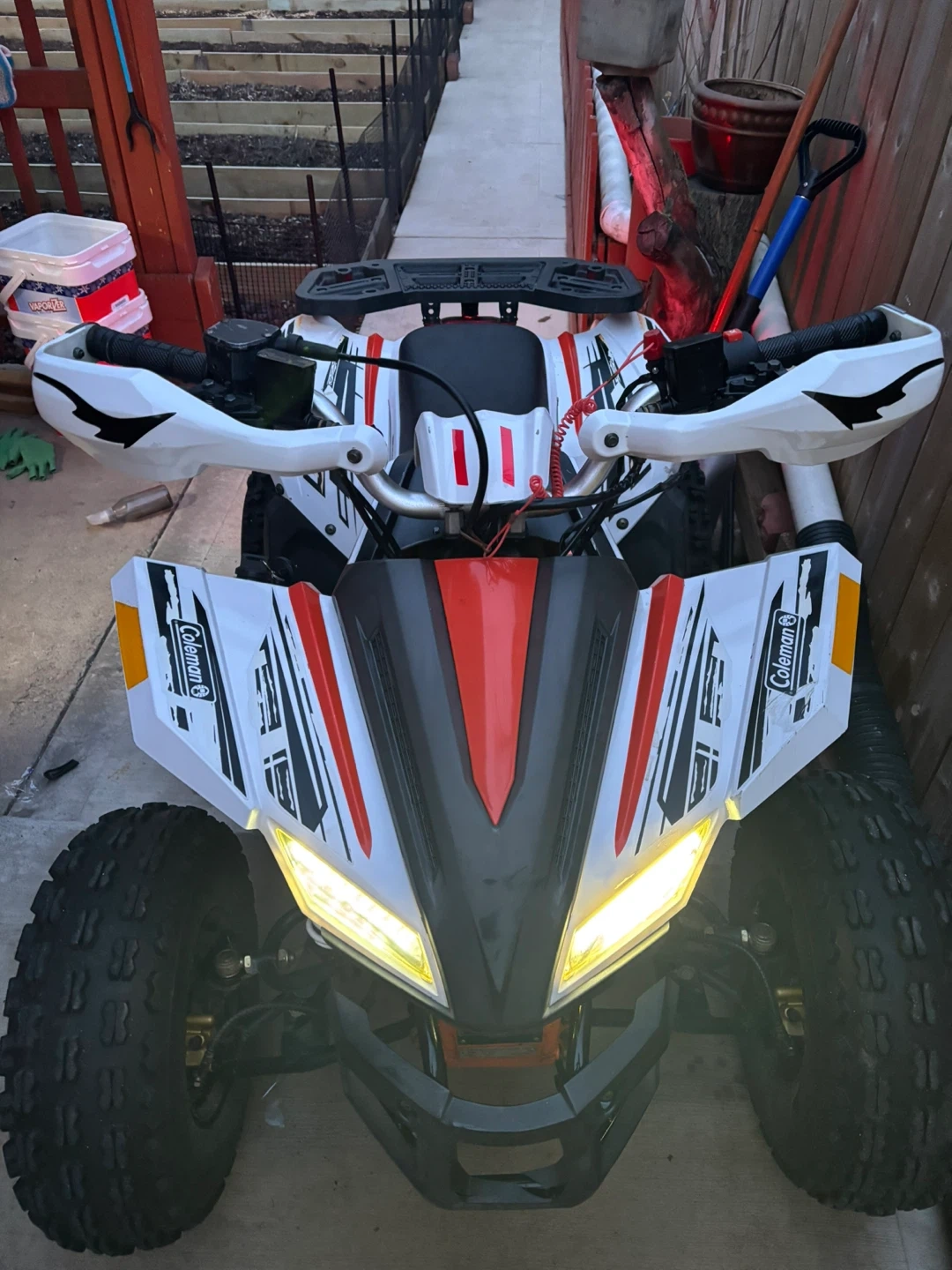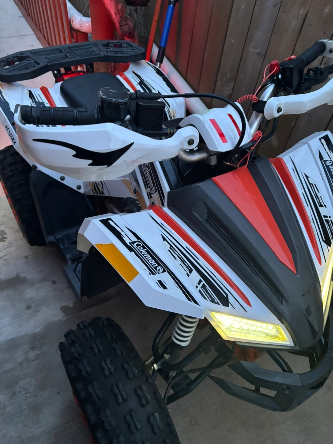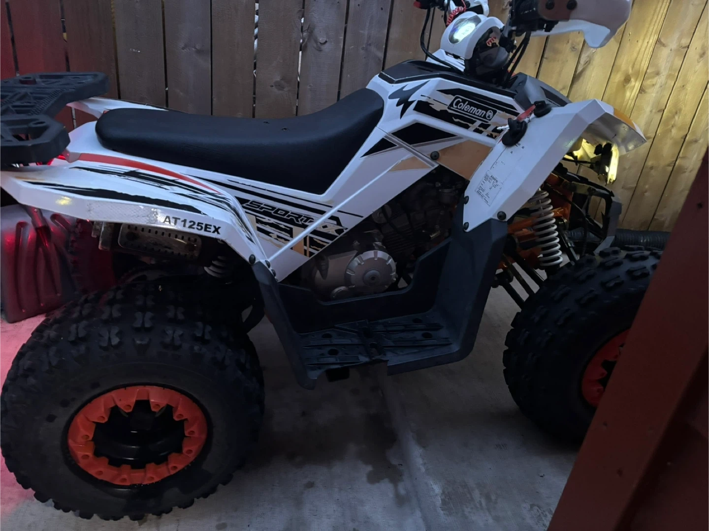 This Coleman AT125EX Sport ATV is white with black and orange accents. It's designed for recreational use and features rugged tires. Perfect for off-road adventures!